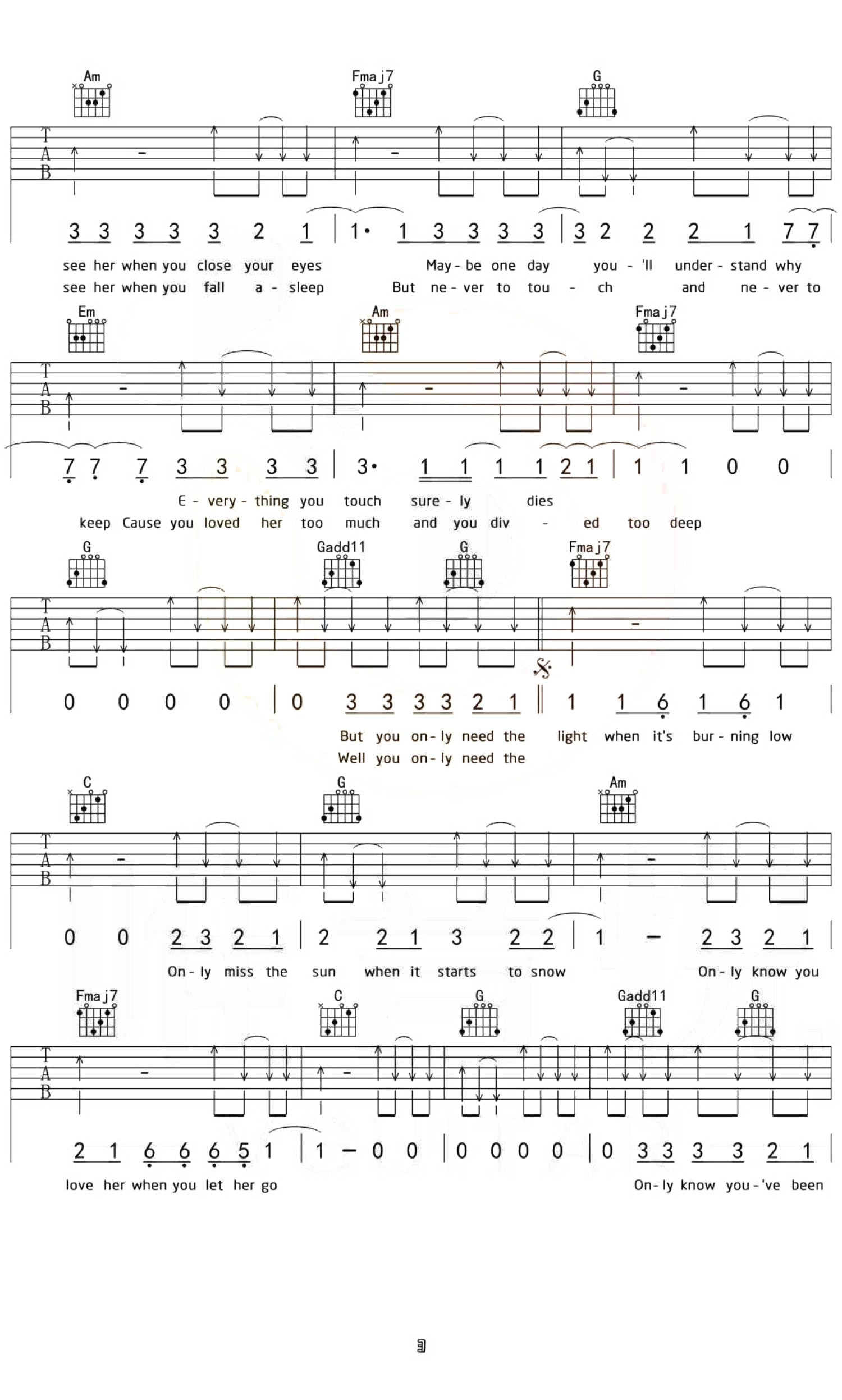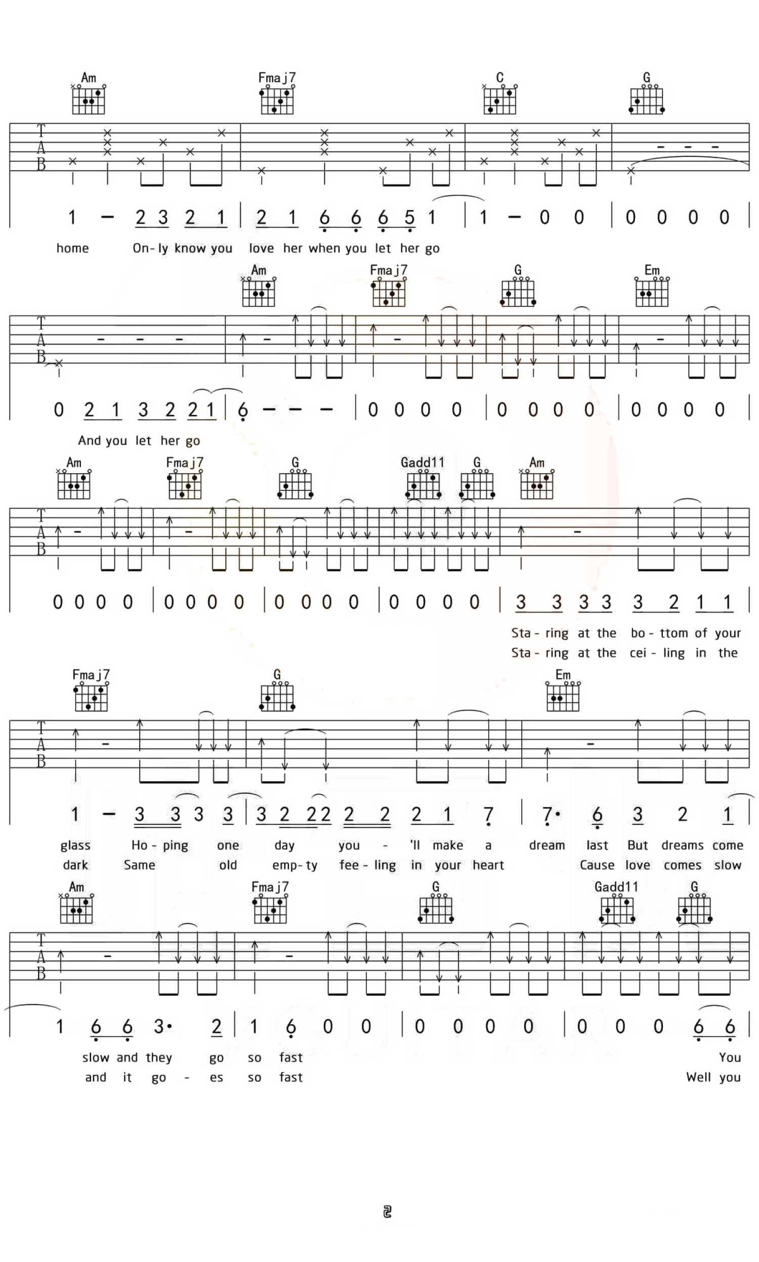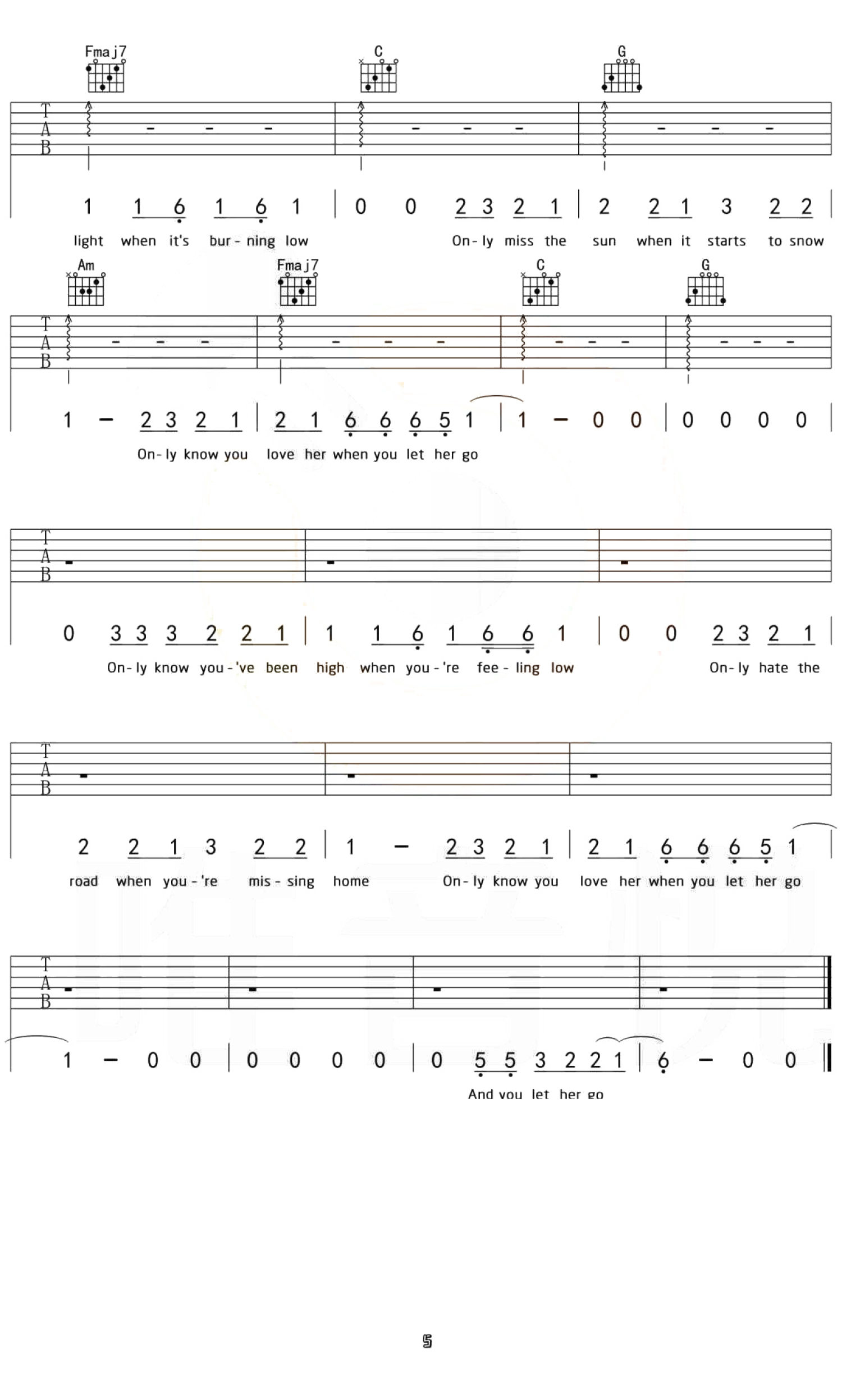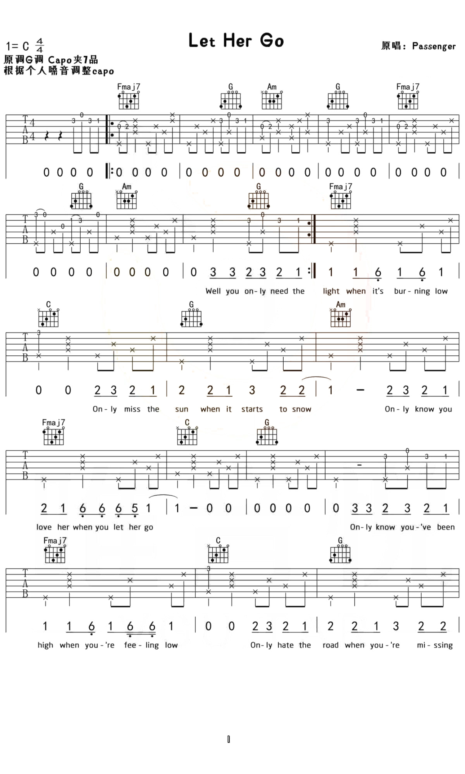 曲谱介绍: 《Let Her Go》吉他谱_Passenger_C调原版弹唱谱_高清六线谱分享,《Let Her Go》是由Passenger演唱的一首英文歌曲。他用独特的嗓音低吟浅唱出一个人失去所爱之后的心情。有人说这首歌的专辑封面,有一种傍晚打开窗户的唯美画面,也有人说这首歌能够带来一些共鸣,正因为逝去,才有怀念的理由。 歌曲原调为G调,这里采用了C调指法根据原版进行编配,演唱时可根据个人的嗓音情况夹变调夹。歌曲编配难度不大,使用的和弦及节奏型都十分简单,比较容易练习。