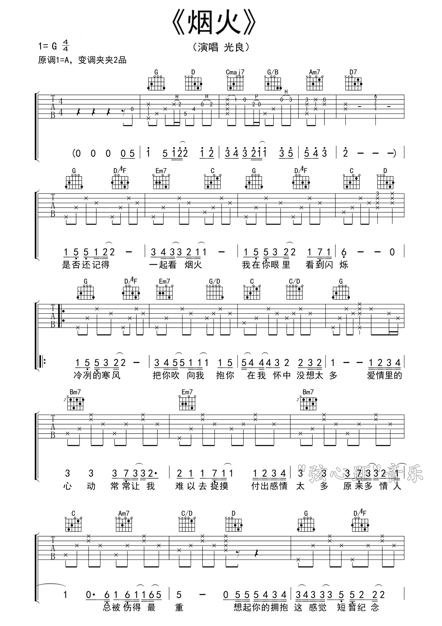 曲谱介绍: 烟火是光良的情歌专辑《不会分离》里面的一首动听歌曲,作曲光良作词孔胜民。烟火吉他曲谱弹唱并不复杂,琴友们在弹唱之前将前奏间奏尾奏练习熟练即可