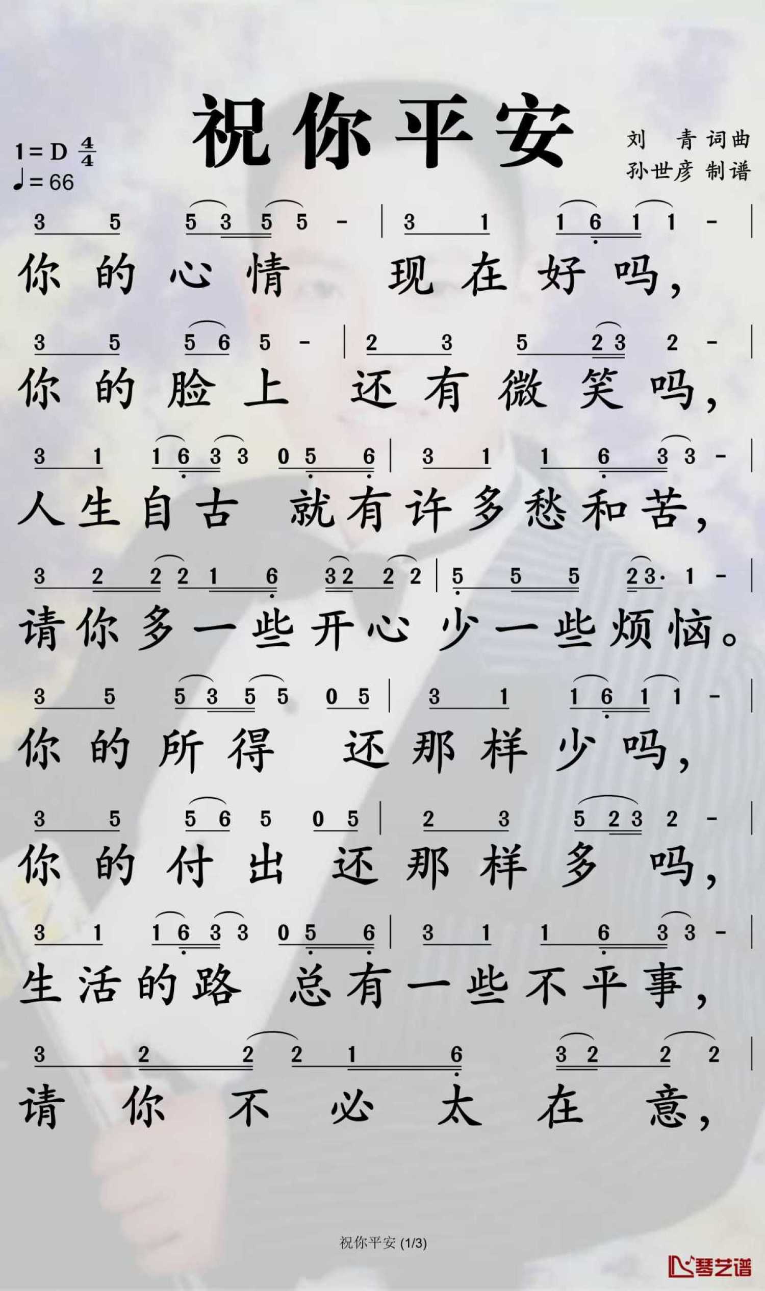 曲谱介绍: 孙悦《祝你平安》歌词_简谱