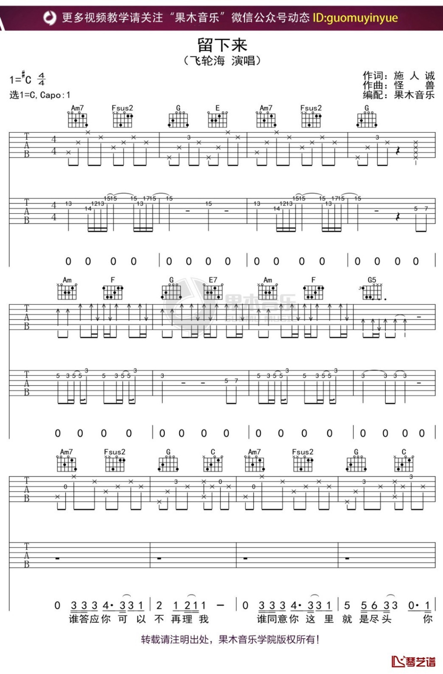曲谱介绍: 飞轮海《留下来》吉他谱_C调吉他弹唱谱