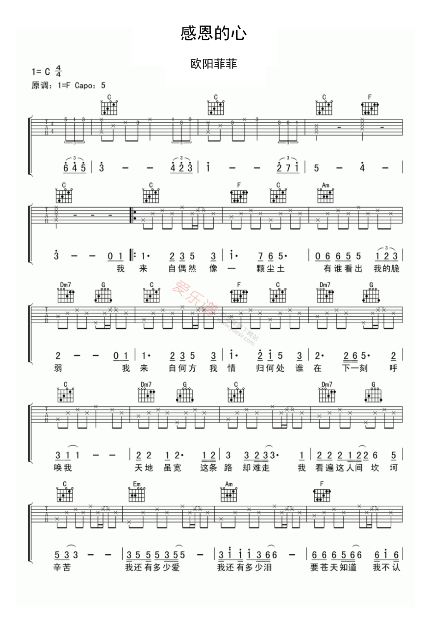 曲谱介绍: 欧阳菲菲《感恩的心》吉他谱_C调吉他弹唱谱