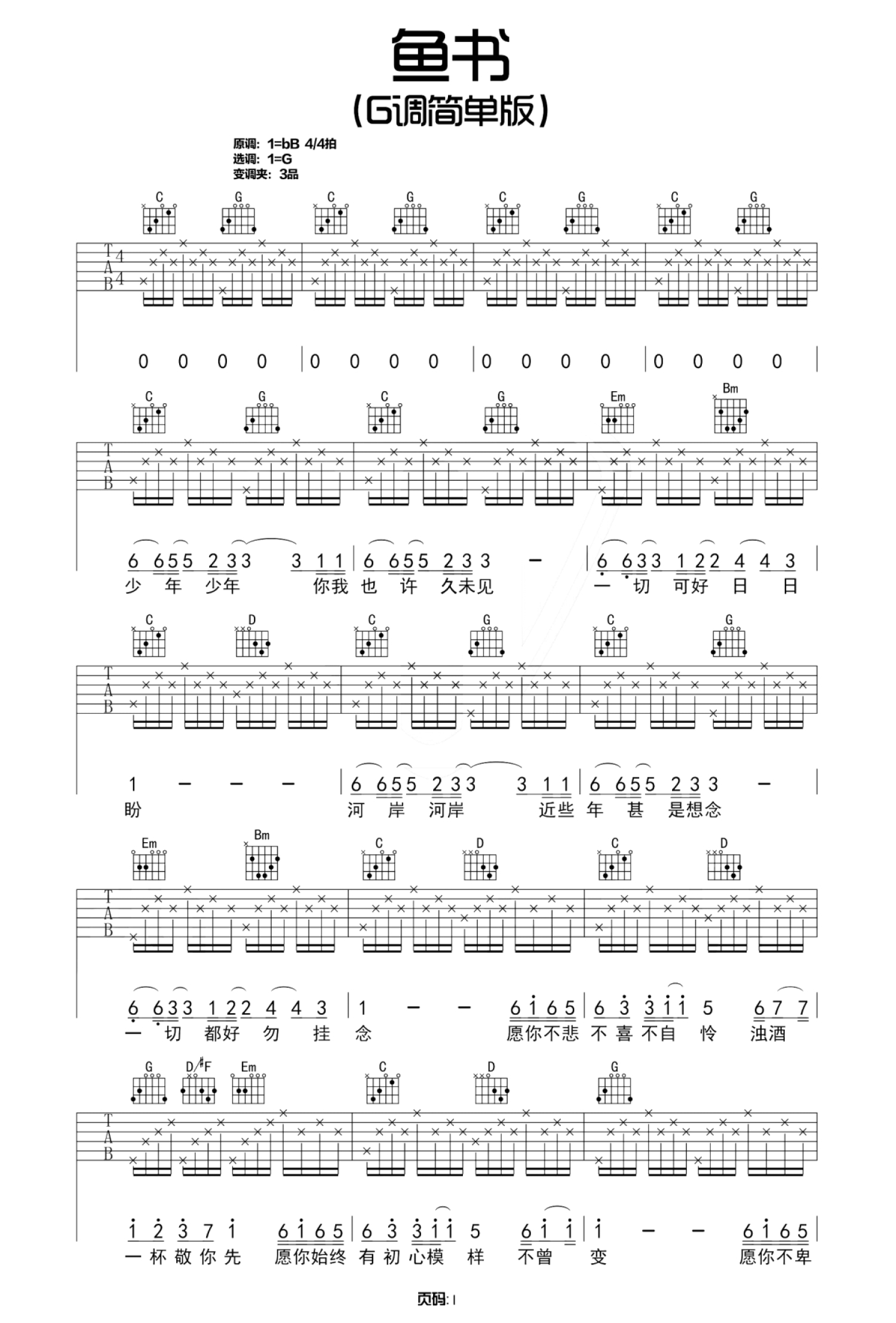 曲谱介绍: 陈鸿宇《鱼书》吉他谱_G调吉他弹唱谱