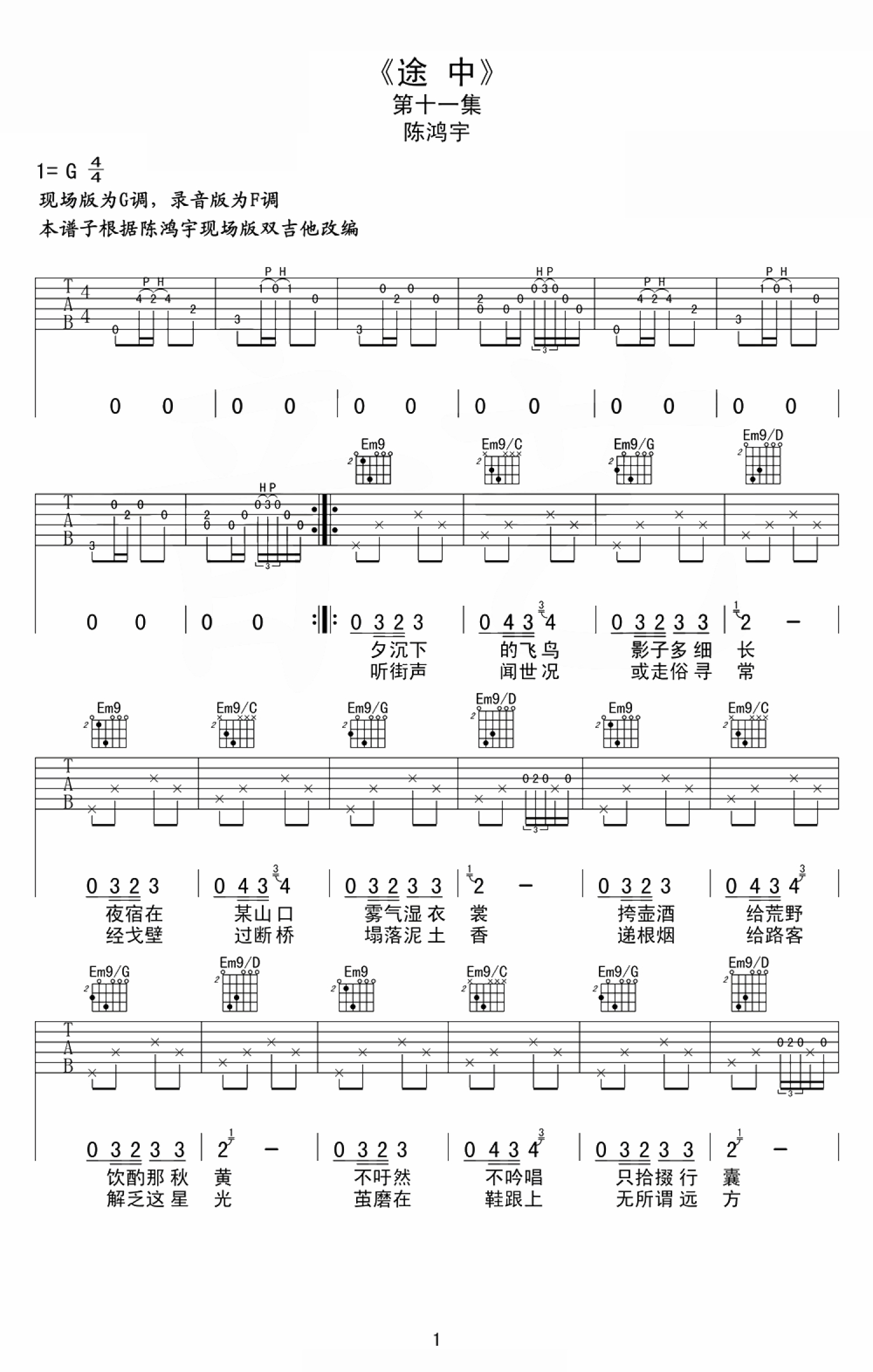 曲谱介绍: 途中吉他谱,陈鸿宇演唱,现场版为G调,录音版为F调,本曲谱根据的是陈鸿宇现场版双吉他改编。歌曲的意义开始和人生的经历契合,一首简单的民谣终于成为生命感悟的一部分。