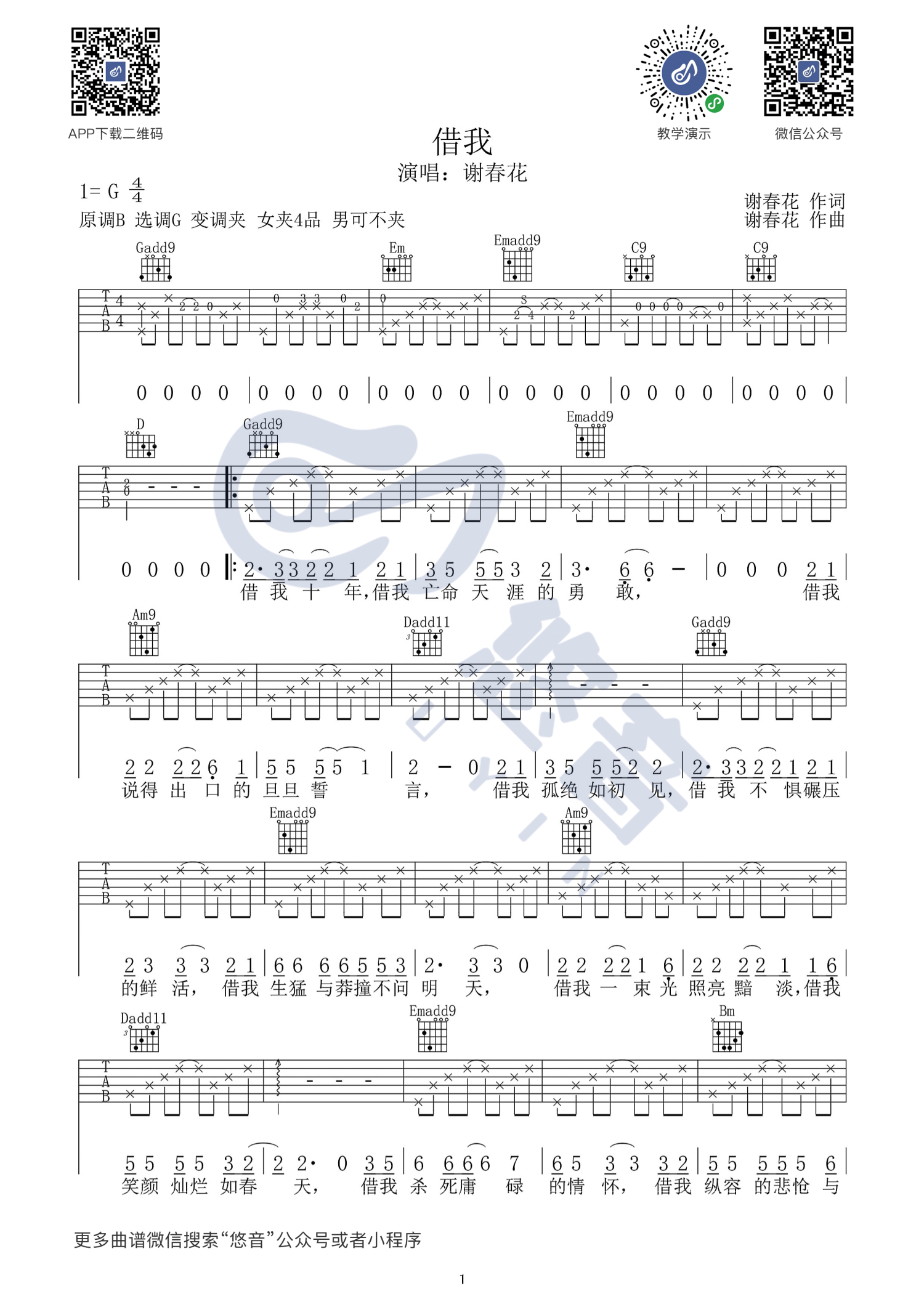 曲谱介绍: 谢春花《借我》吉他谱_G调吉他弹唱谱