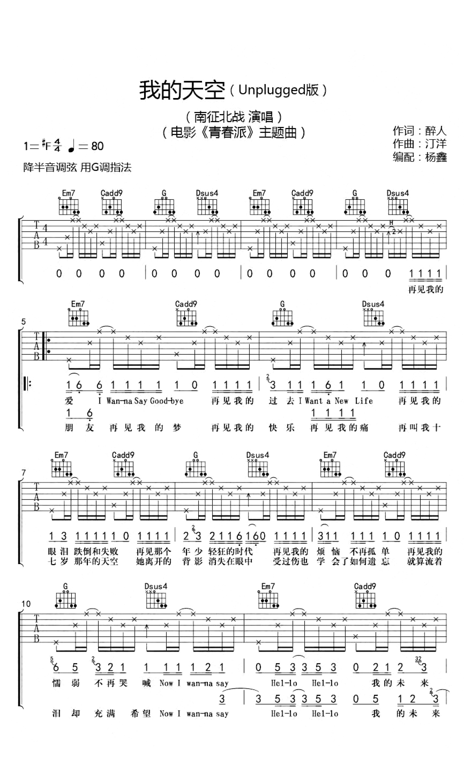 曲谱介绍: 我的天空吉他谱,南征北战乐队演唱,电影《青春派》主题曲,降半音调弦,用G调指法。南征北战一首激情四射的摇滚歌,用呐喊唱出的梦想!句句唱出那个轻狂年代追梦途中遇到的点滴,路虽不平,但每一次跌倒都是成长,只要心里还有梦,总有人会为你感动!《我的天空》送给所有心存梦想的人们,抛开低落的心情,拨开让人迷茫的云雾,勇敢向过去说再见,坚定迈向前方,终会看到彩虹。