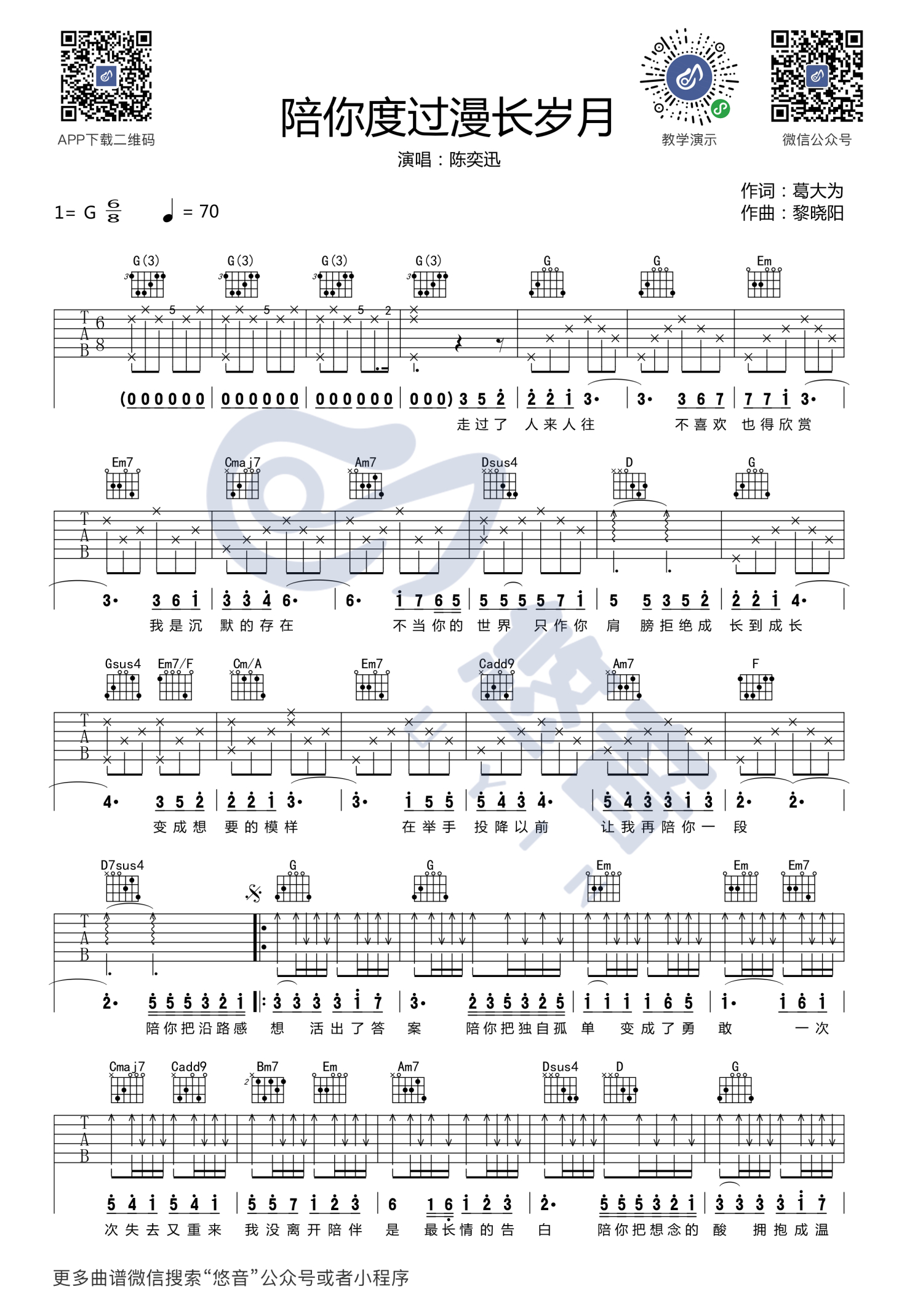 曲谱介绍: 陈奕迅《陪你度过漫长岁月》吉他谱_G调吉他弹唱谱