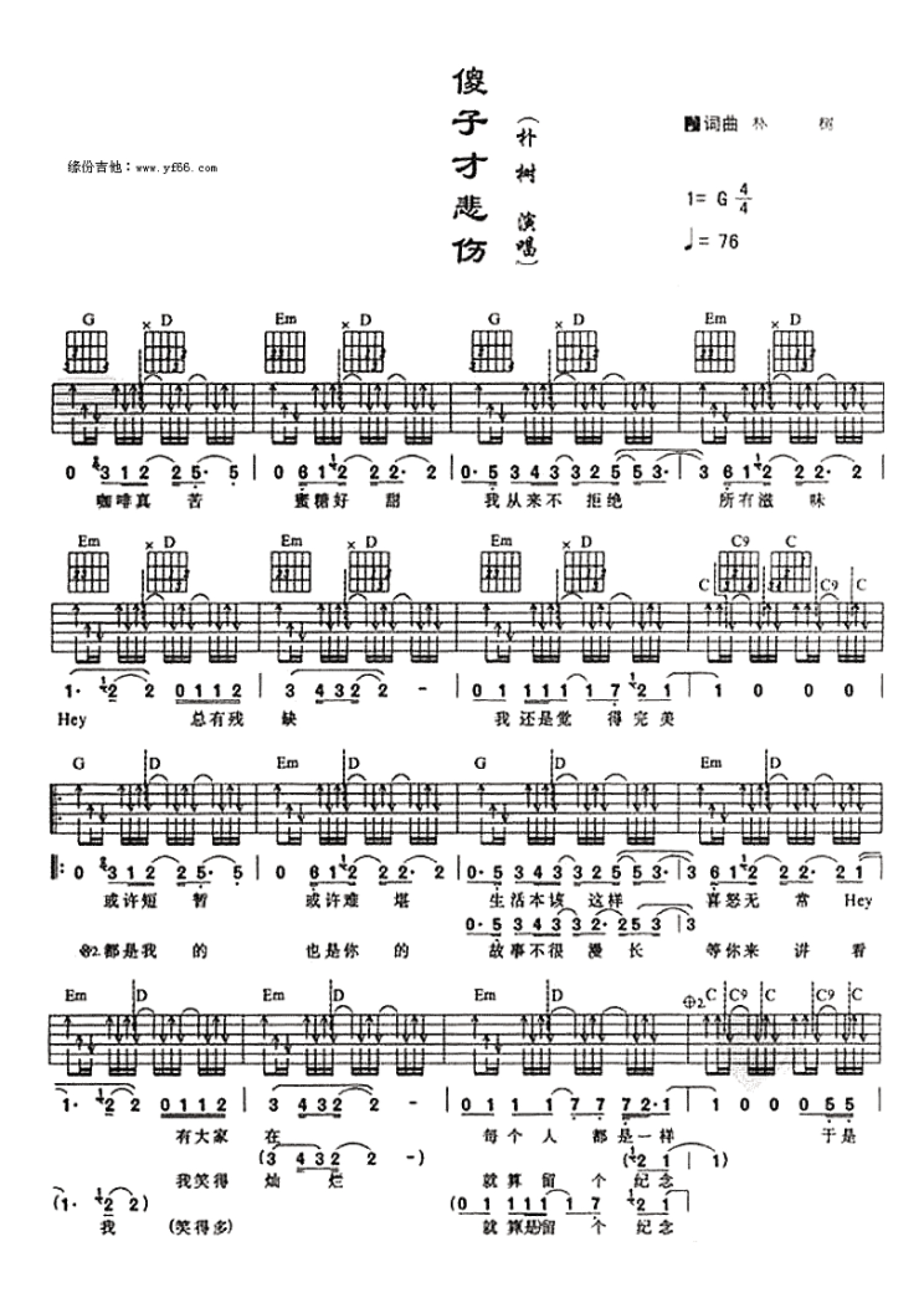 曲谱介绍: 朴树《傻子才悲伤》吉他谱_G调吉他弹唱谱_复印版