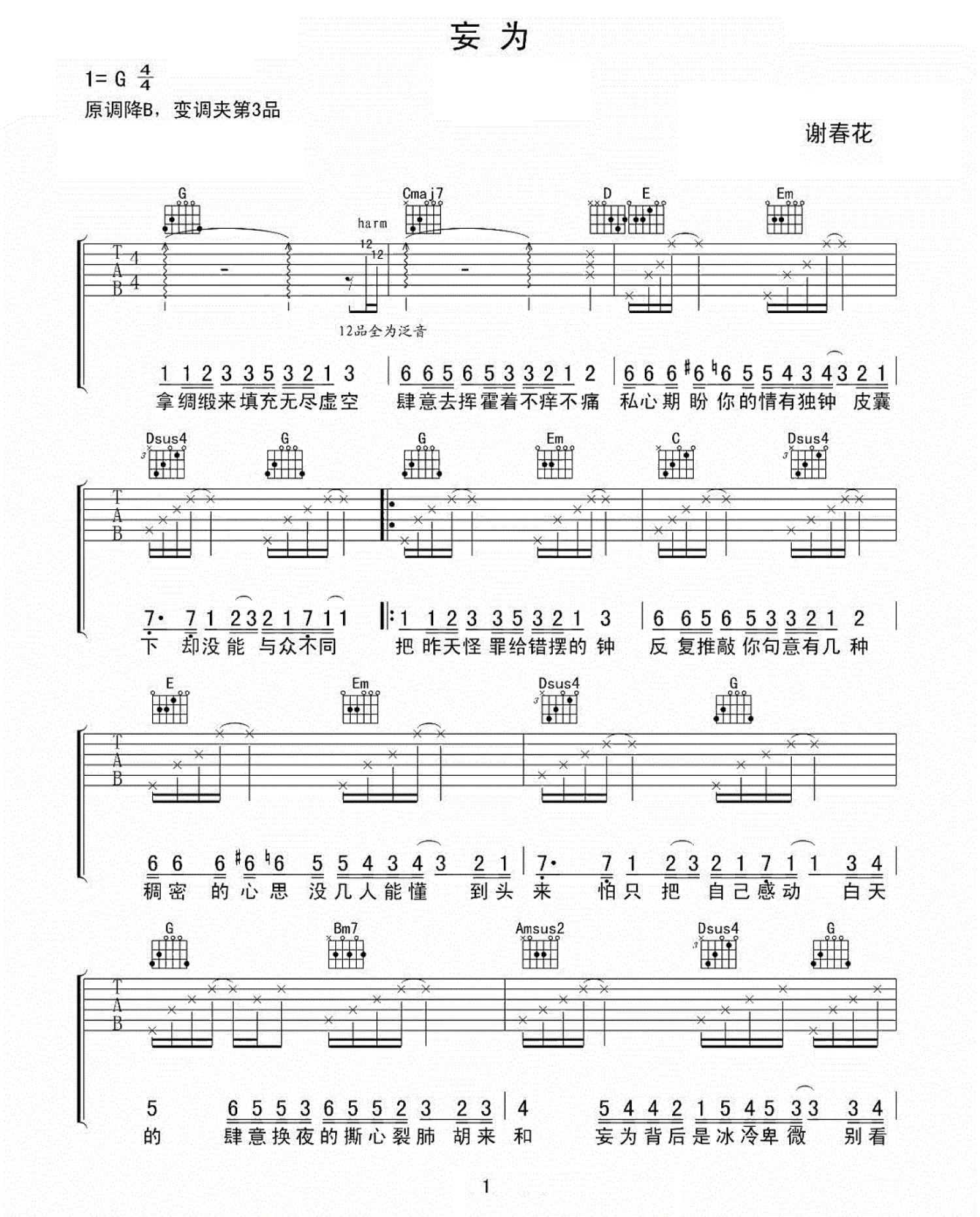 曲谱介绍: 谢春花《妄为》吉他谱_G调吉他弹唱谱