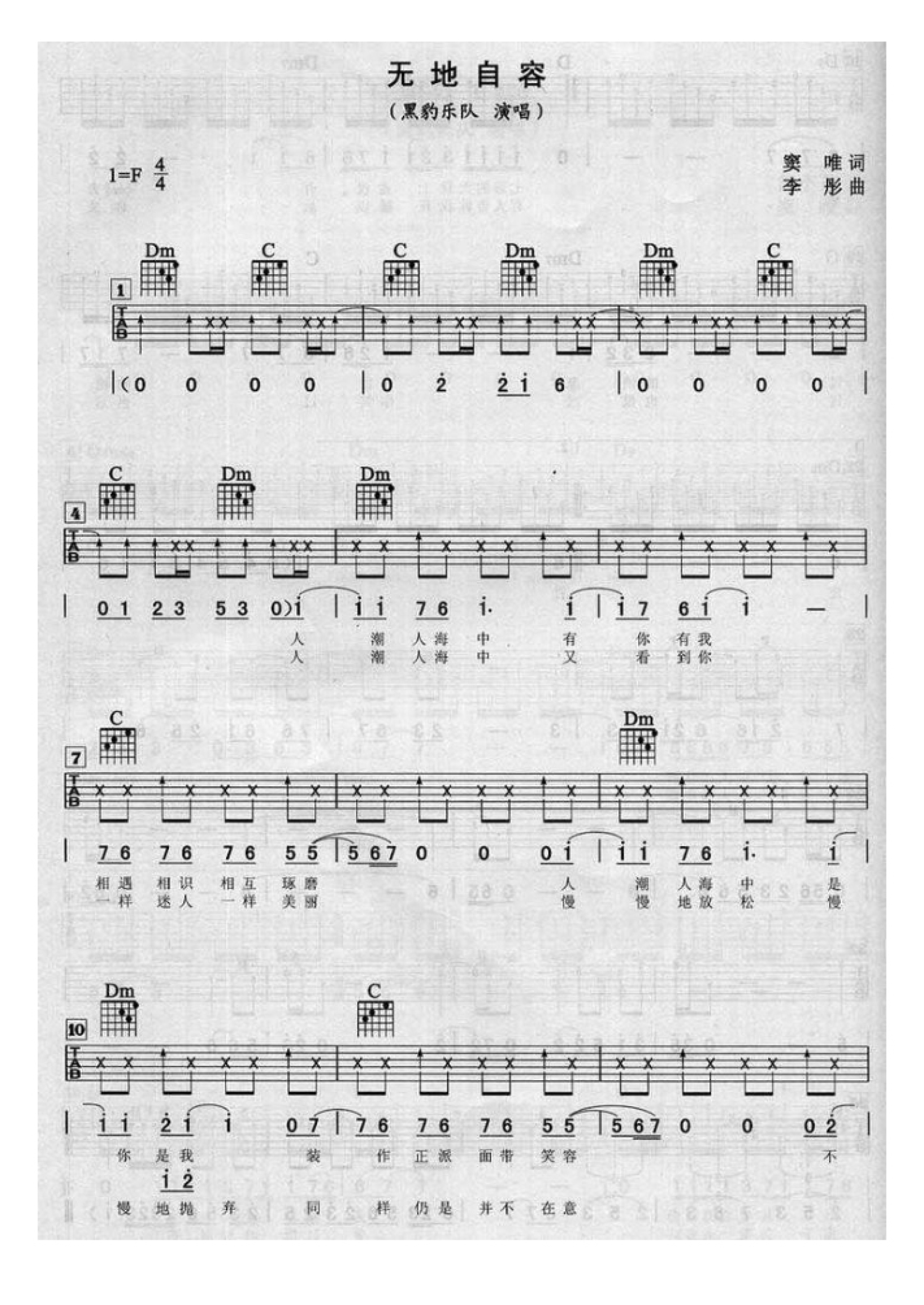 无地自容吉他谱 - 黑豹乐队 - F调吉他弹唱谱 - 复印版