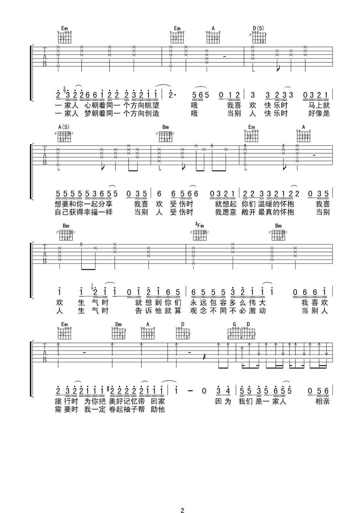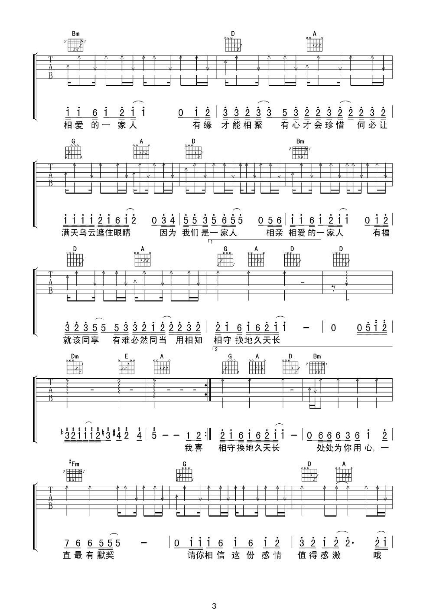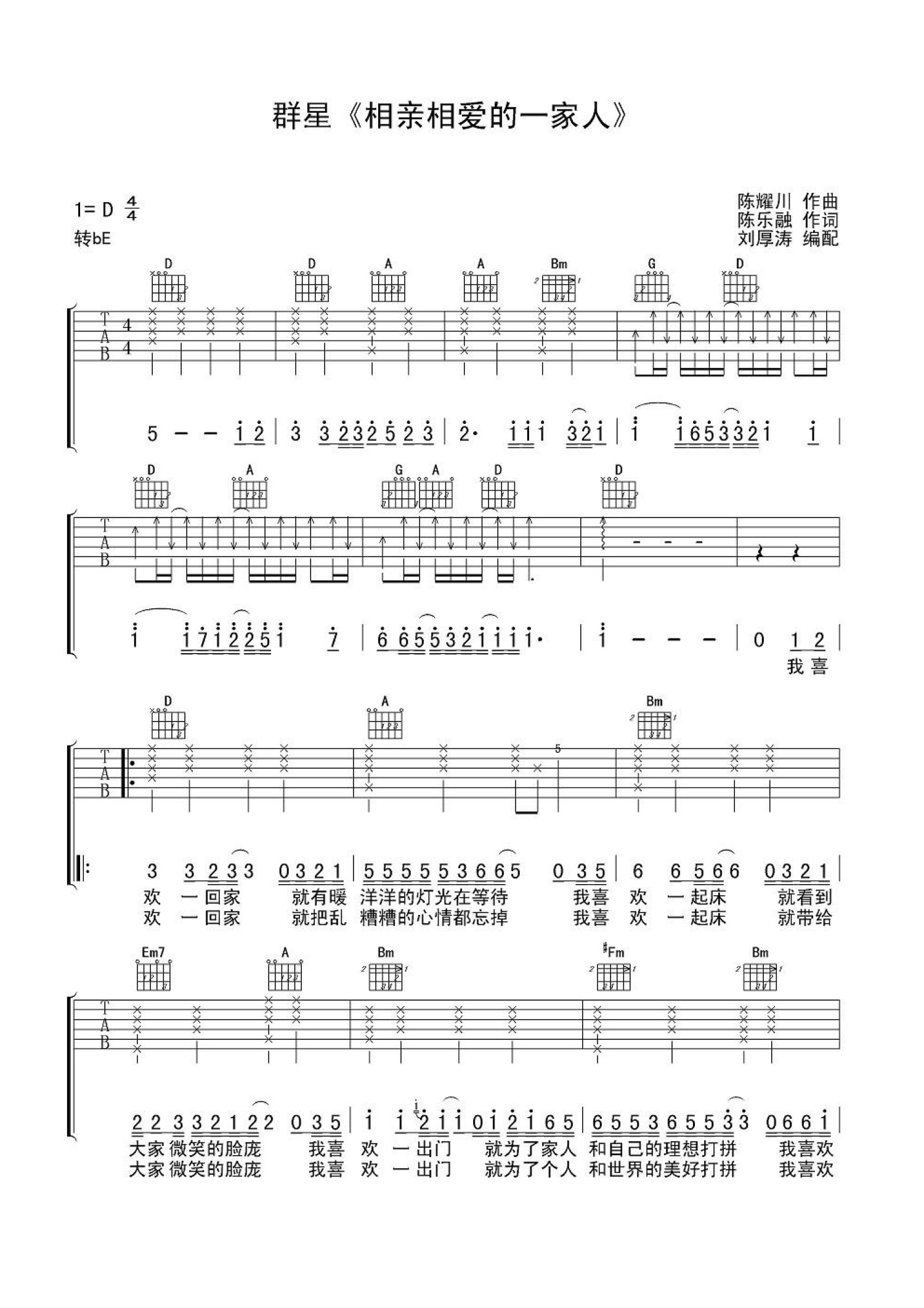 曲谱介绍: 群星《相亲相爱一家人》吉他谱_D调吉他弹唱谱