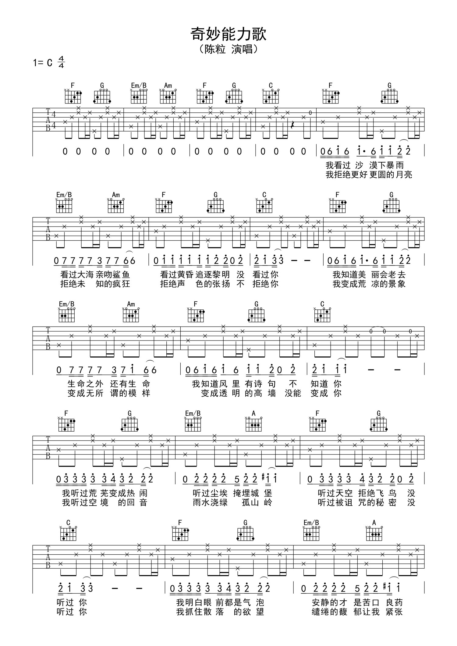 • 奇妙能力歌吉他谱 - 陈粒 - C调吉他弹唱谱第1张