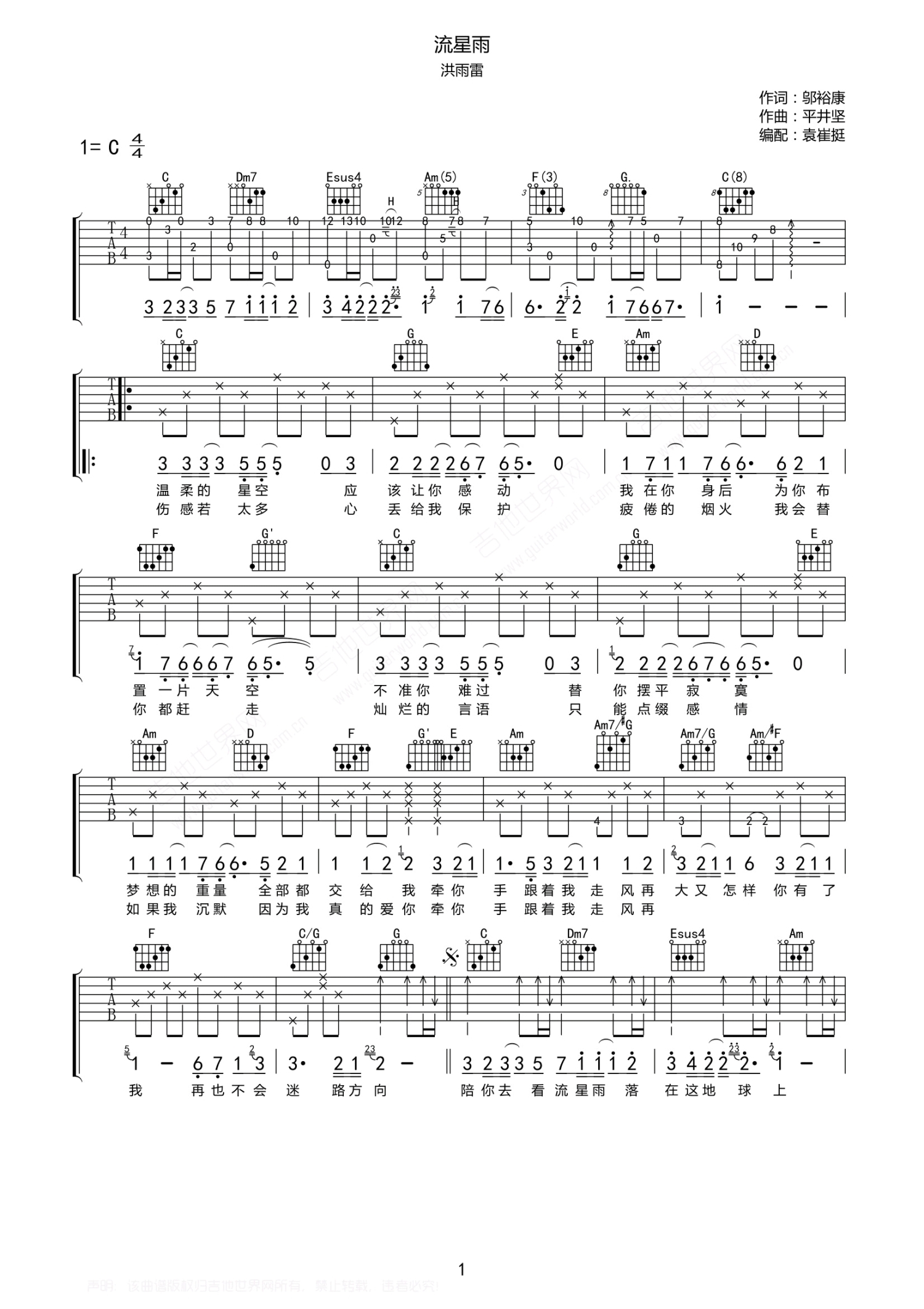 曲谱介绍: f4《流星雨》吉他谱_C调吉他弹唱谱