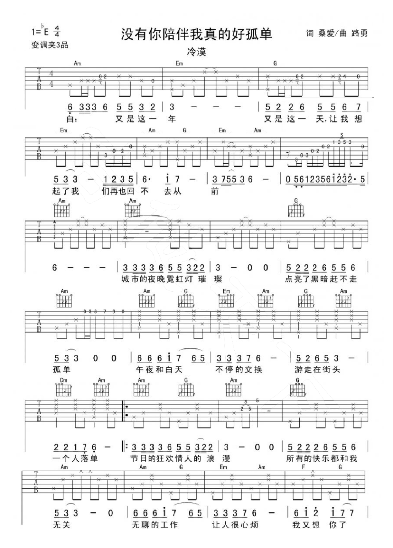 没有你陪伴我真的好孤单吉他谱 - 冷漠 - 吉他弹唱谱