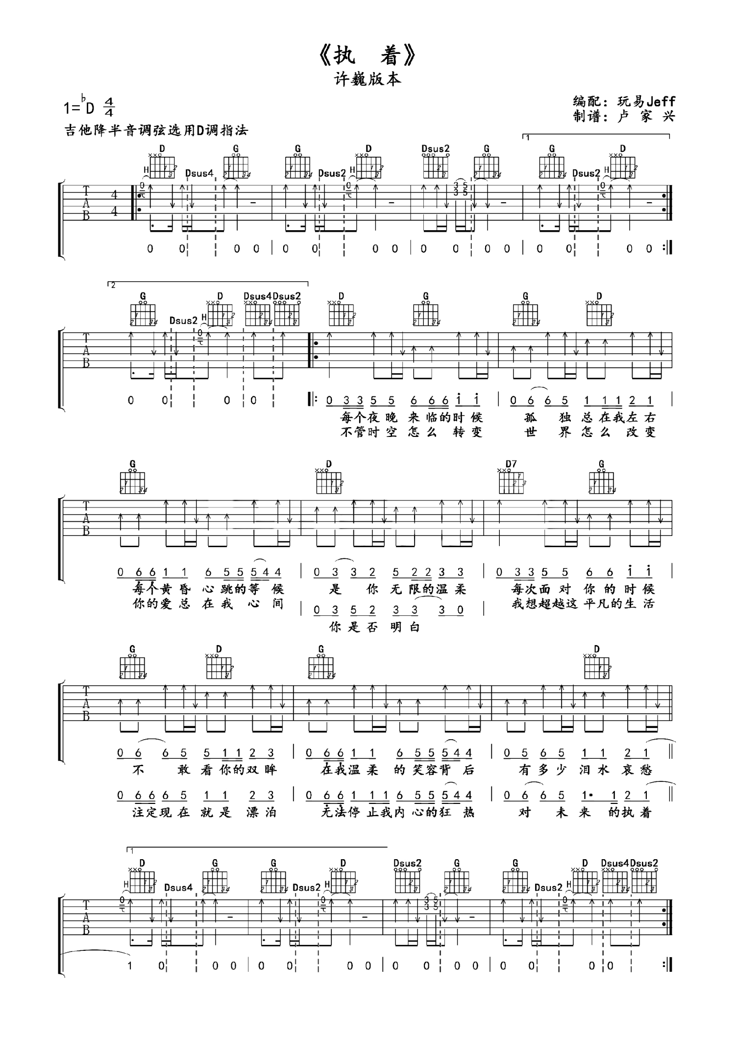 曲谱介绍: 许巍《执着》吉他谱_D调吉他弹唱谱