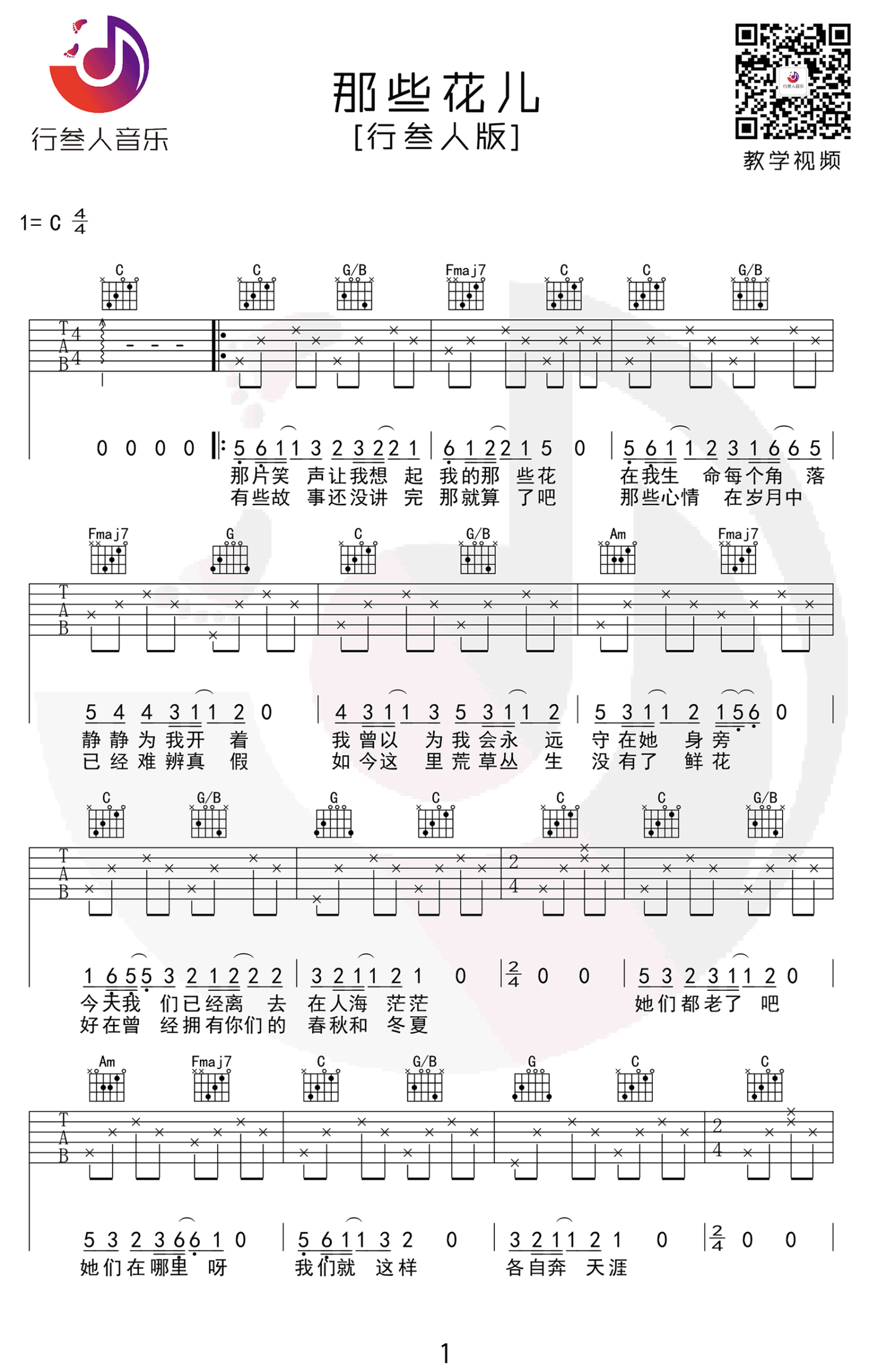 曲谱介绍: 范玮琪《那些花儿》吉他谱_C调吉他弹唱谱