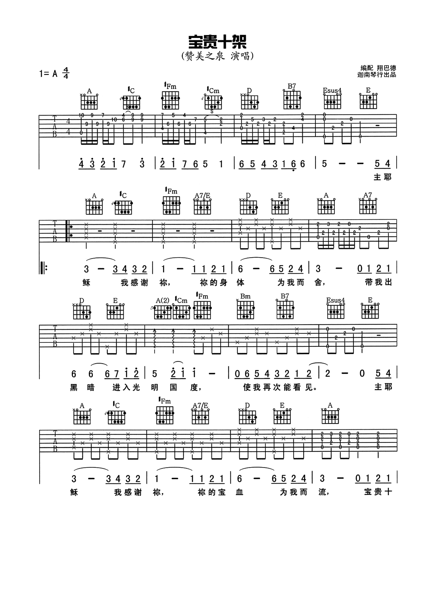 曲谱介绍: 赞美诗《宝贵十架》吉他谱_A调吉他弹唱谱