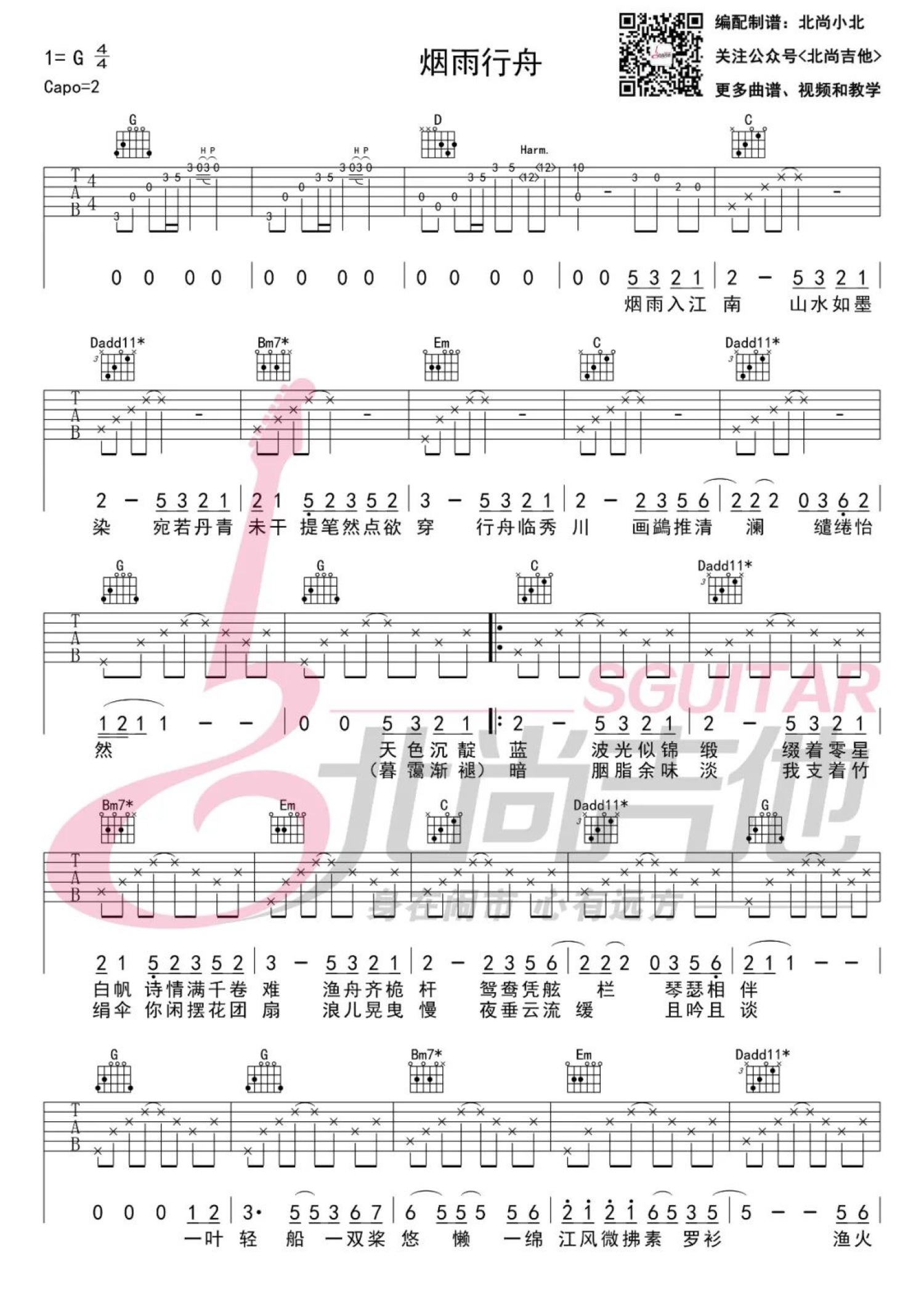 曲谱介绍: 小北《烟雨行舟》吉他谱_G调吉他弹唱谱
