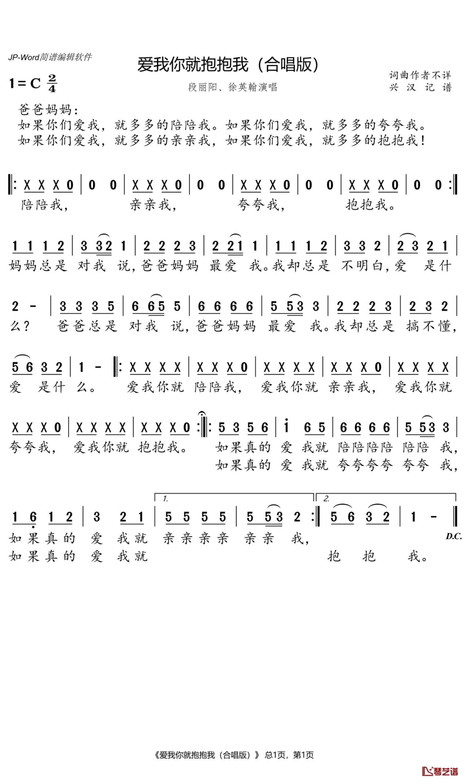 爱我你就抱抱我简谱 - 段丽阳/徐英翰 - 合唱版