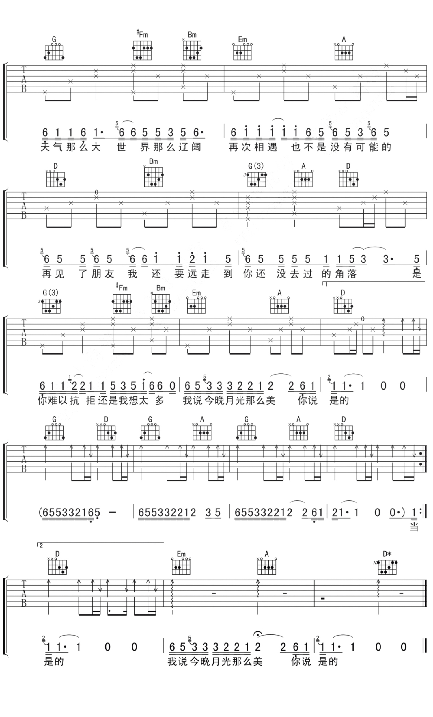曲谱介绍: 好妹妹乐队《我说今晚月光那么美,你说是的》吉他谱_D调吉他弹唱谱