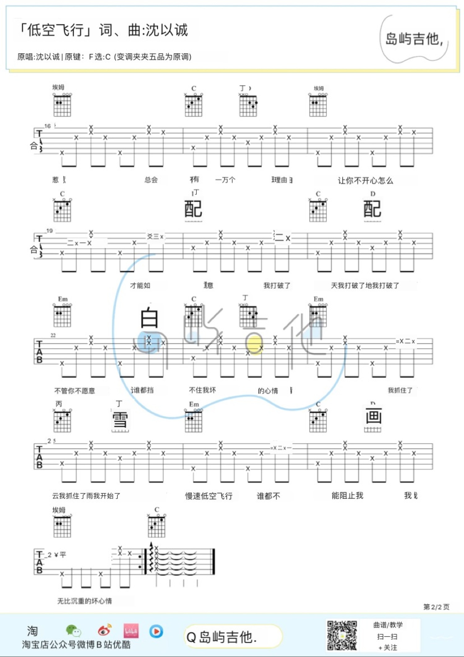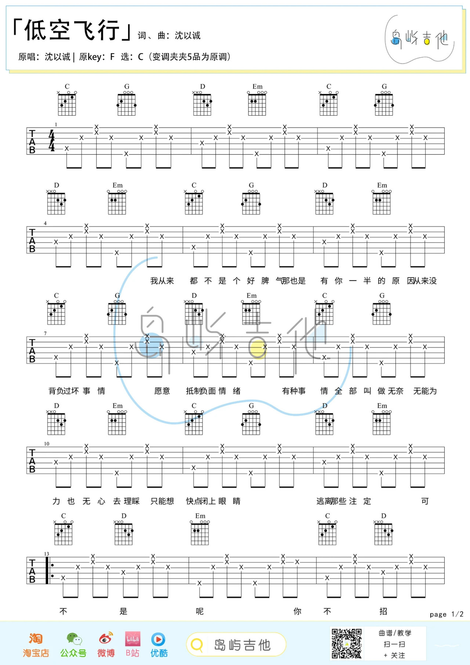 曲谱介绍: 沈以诚《低空飞行》吉他谱_C调吉他弹唱谱