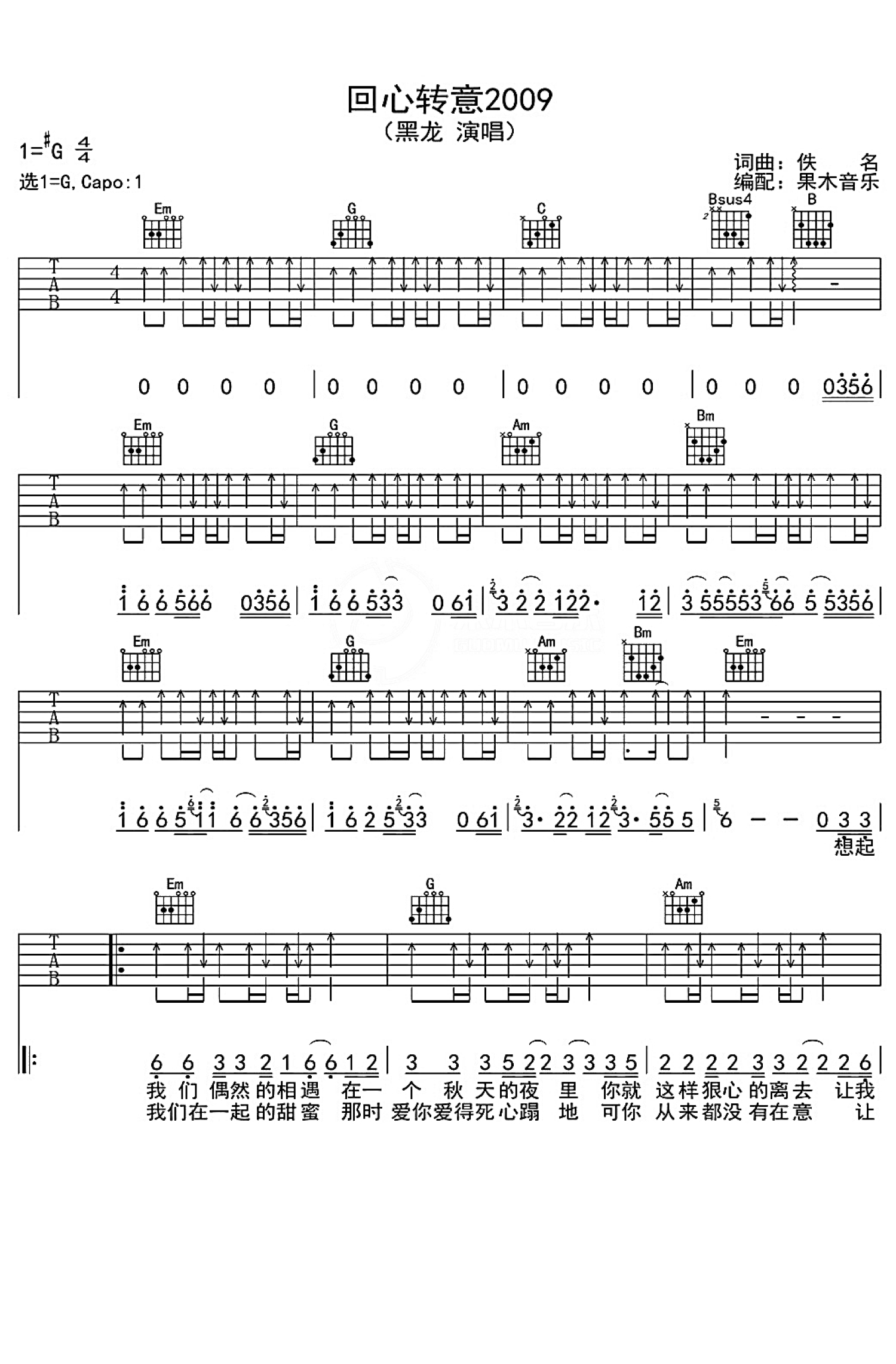 曲谱介绍: 黑龙《回心转意2009》吉他谱_G调吉他弹唱谱