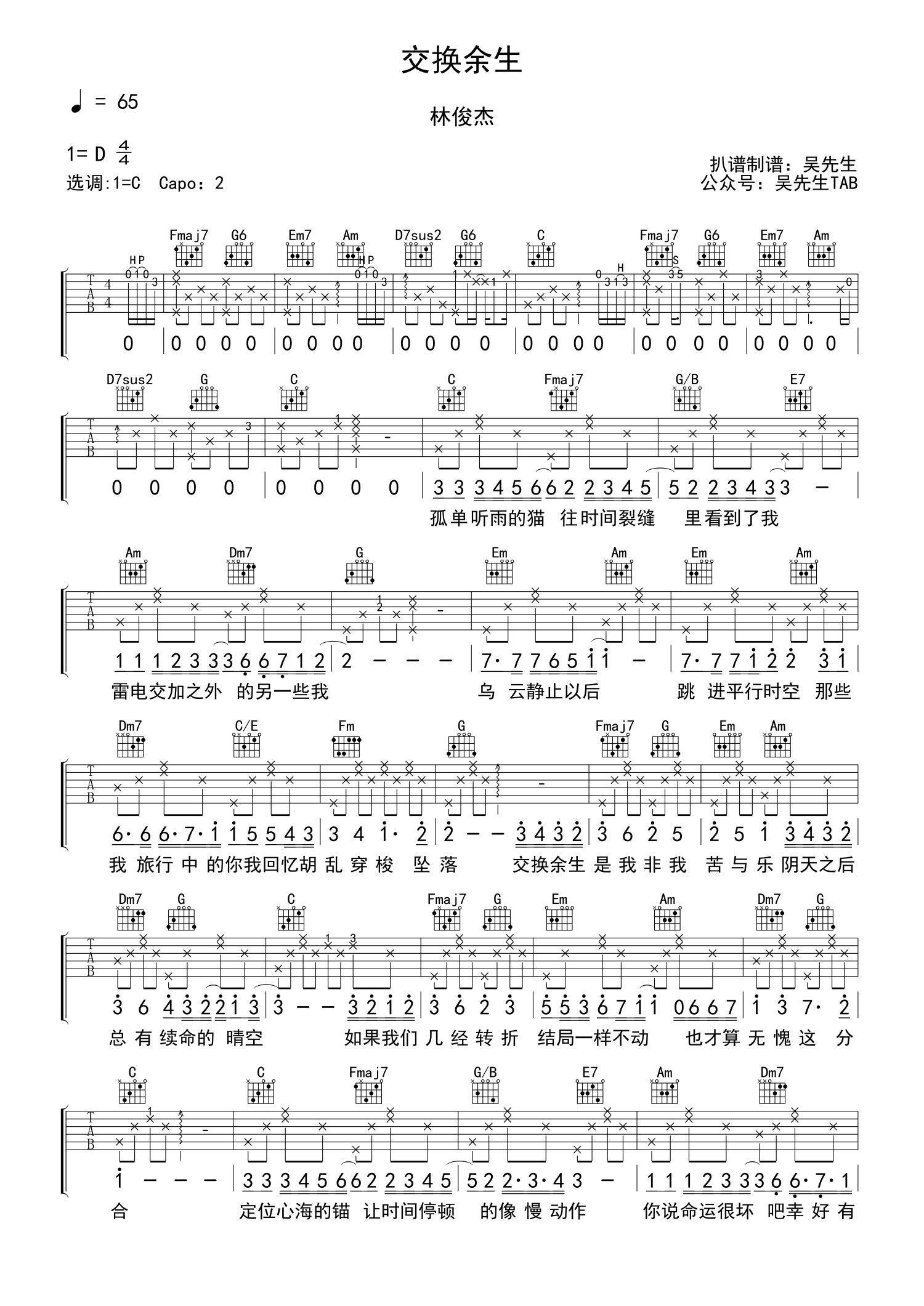 • 交换余生吉他谱 - 林俊杰 - C调吉他弹唱谱第1张