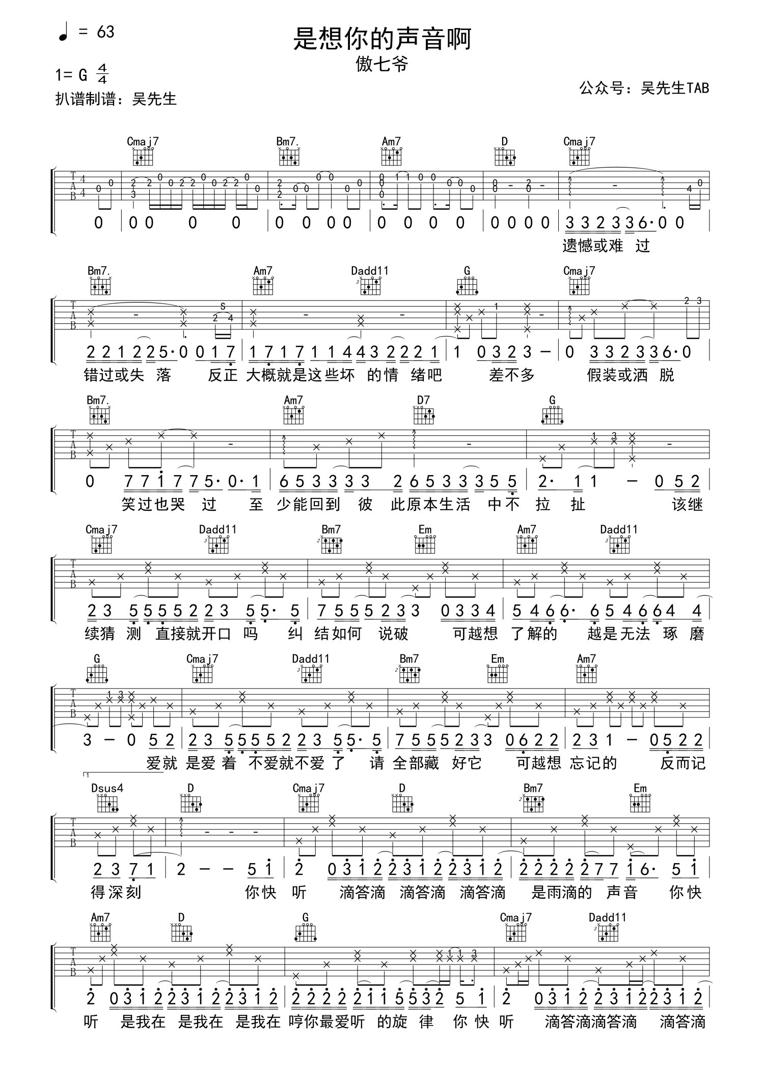 • 是想你的声音啊吉他谱 - 傲七爷 - G调吉他弹唱谱第1张