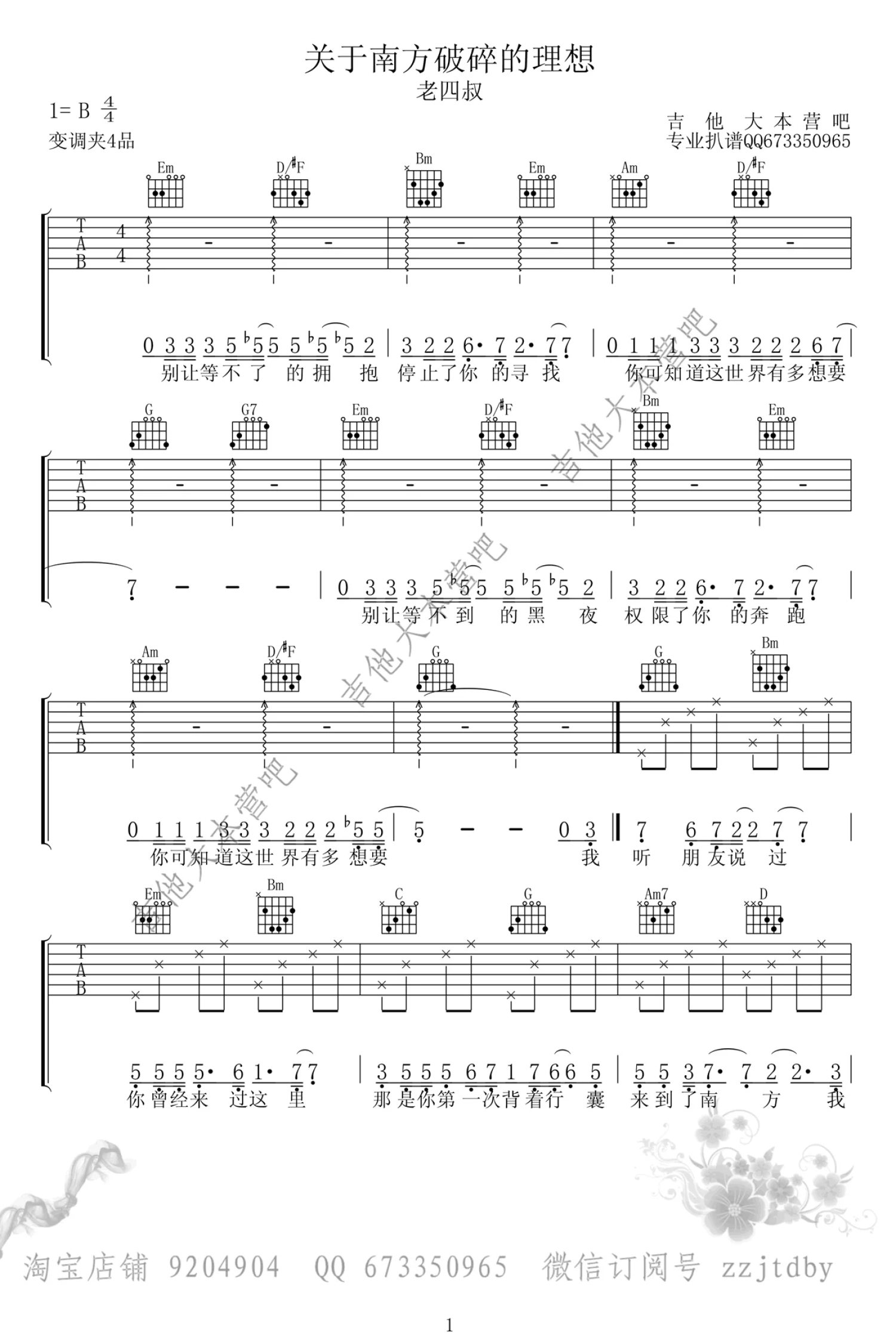 曲谱介绍: 老四叔《关于南方破碎的理想》吉他谱_G调吉他弹唱谱