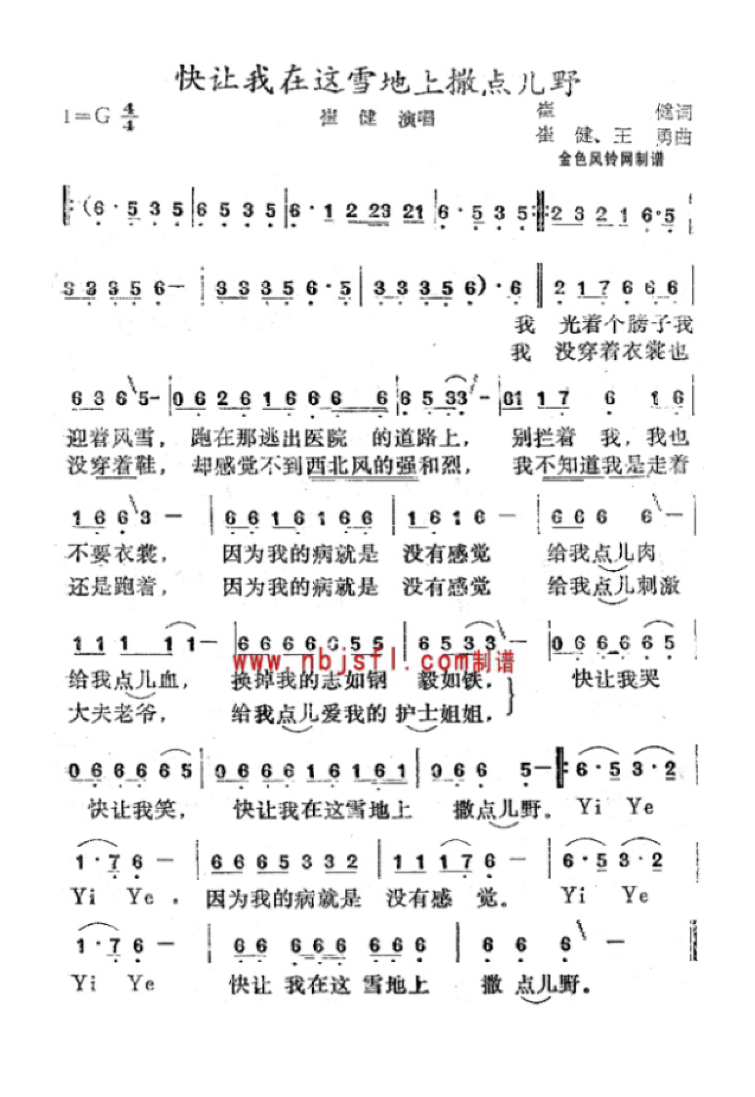 曲谱介绍: 崔健《快让我在这雪地上撒点儿野》歌词_简谱
