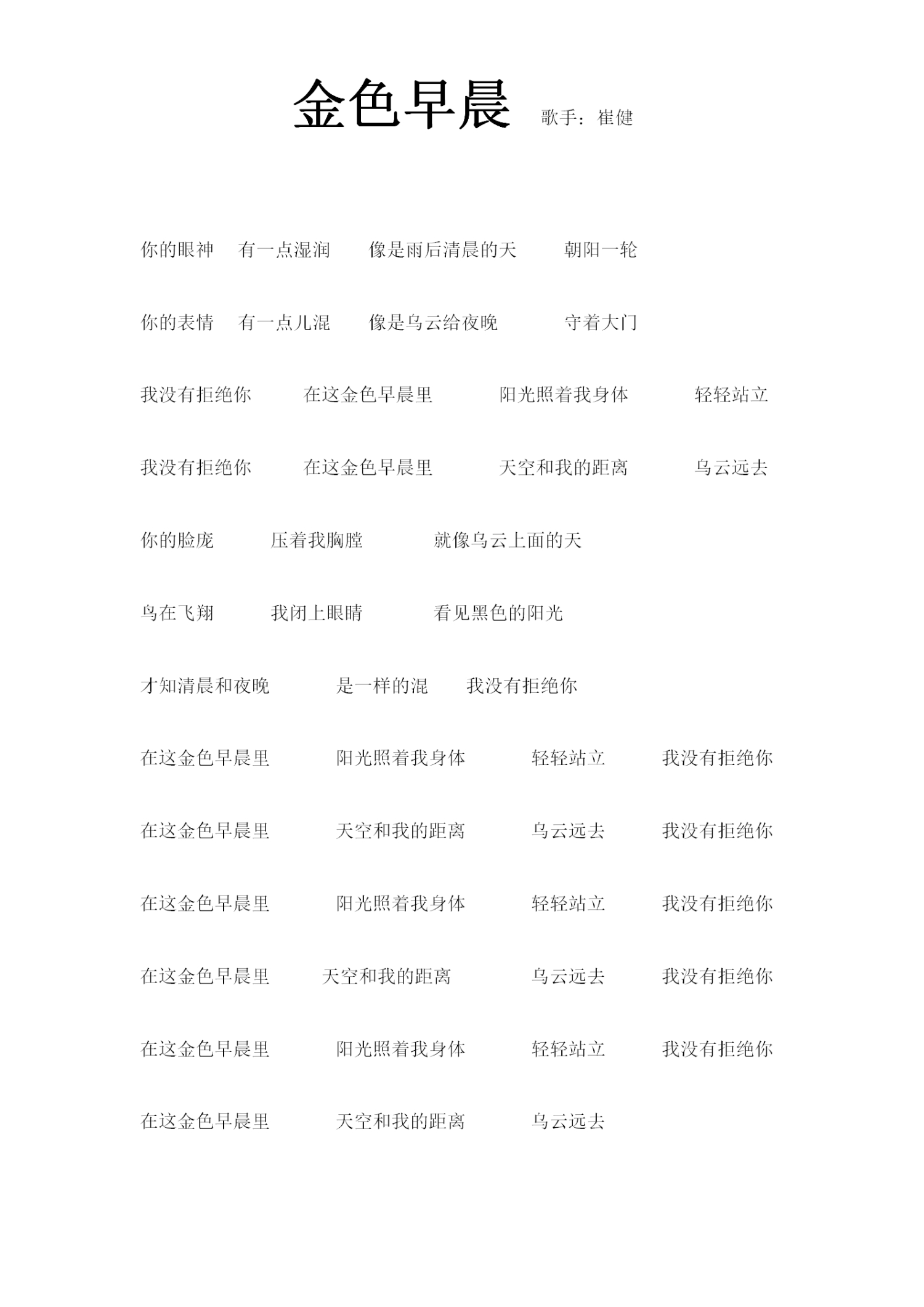 曲谱介绍: 崔健《金色早晨》歌词_简谱_仅歌词