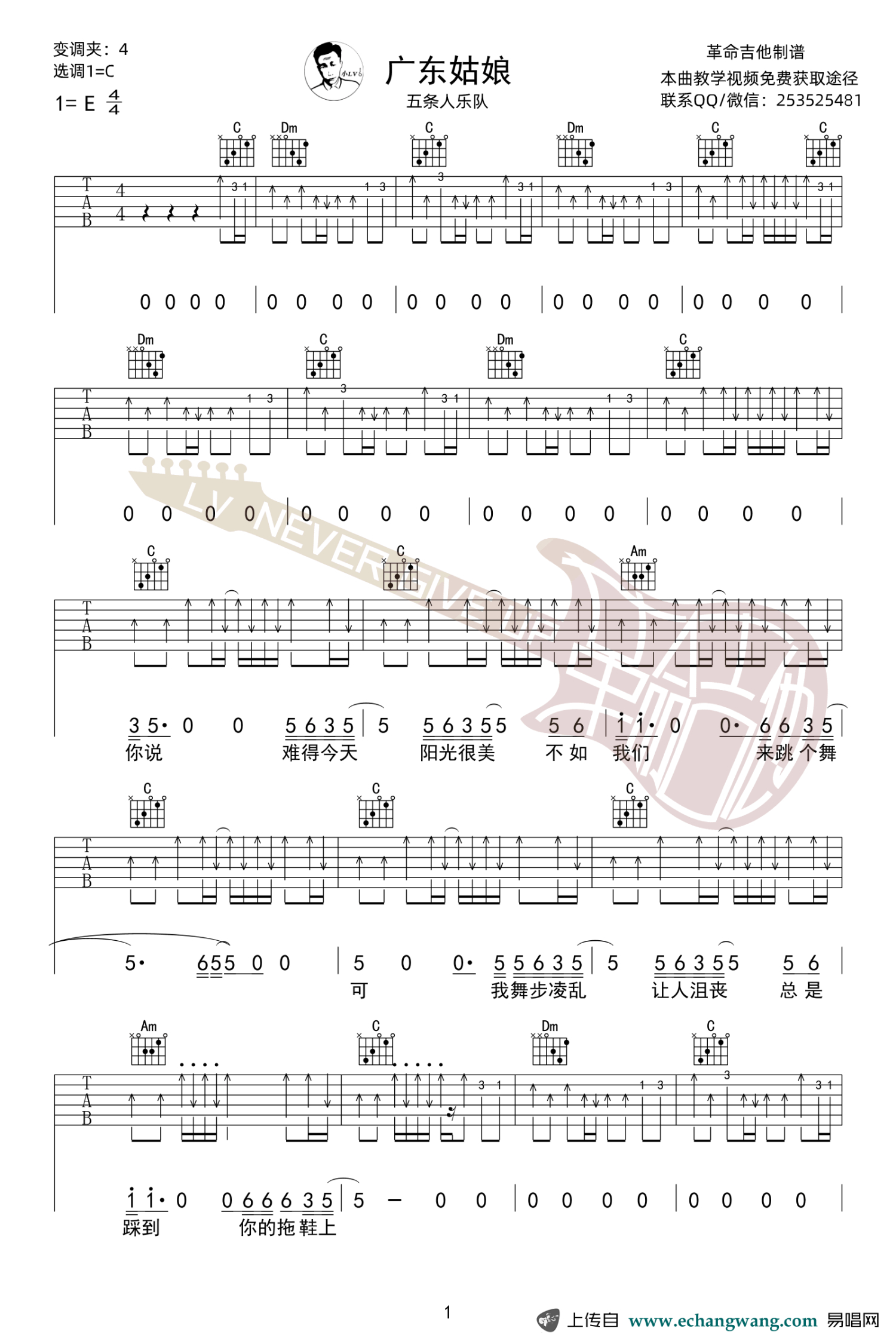 曲谱介绍: 原调E选调C,变调夹四品。广东姑娘吉他弹唱谱,六线谱共四张图片谱例。感谢革命吉他编配分享,打谱啦吉他网上传更新。五条人乐队一首极度好听,听完极度舒适的《广东姑娘》,是仁科写给女朋友的,歌词简单明了,大概在讲:阴雨连绵的日子过去了,我们不如来跳个舞吧!带上小狗,走出房间,一起去散散步吧!随之就是几句“亲爱的广东姑娘,我爱你