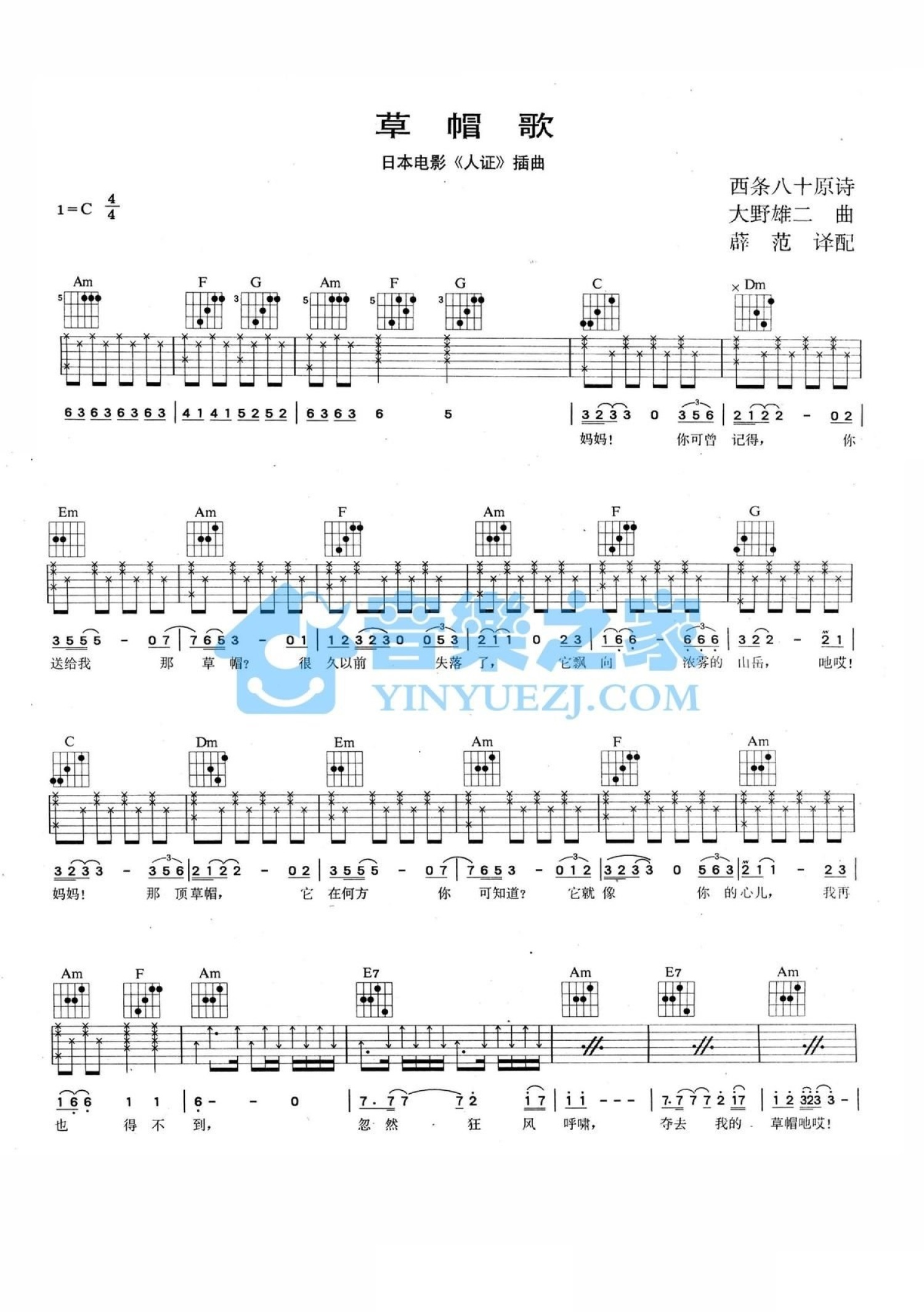 曲谱介绍: 乔山中《草帽歌》吉他谱_C调吉他弹唱谱