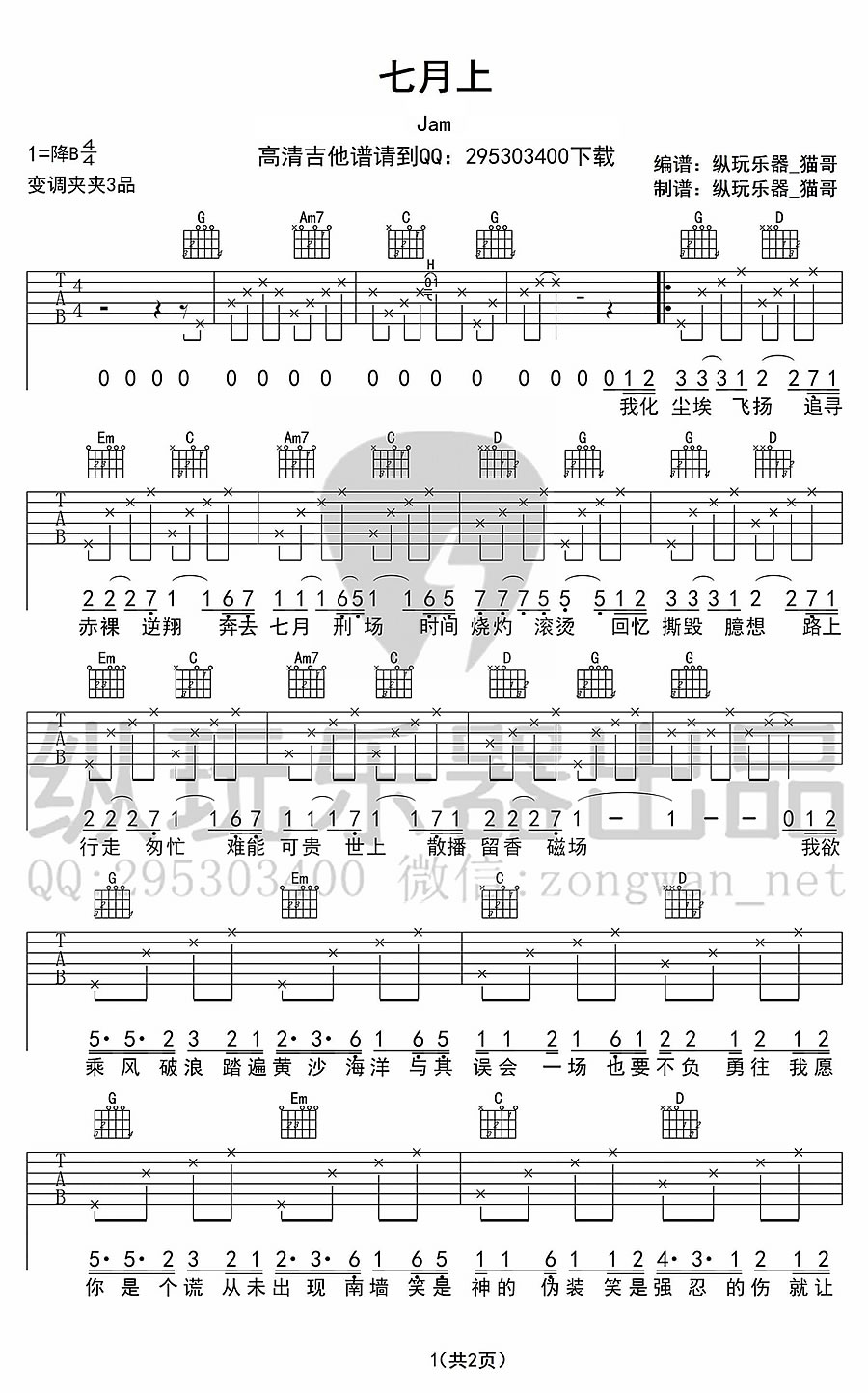 七月上吉他谱 - JAM - 吉他弹唱谱