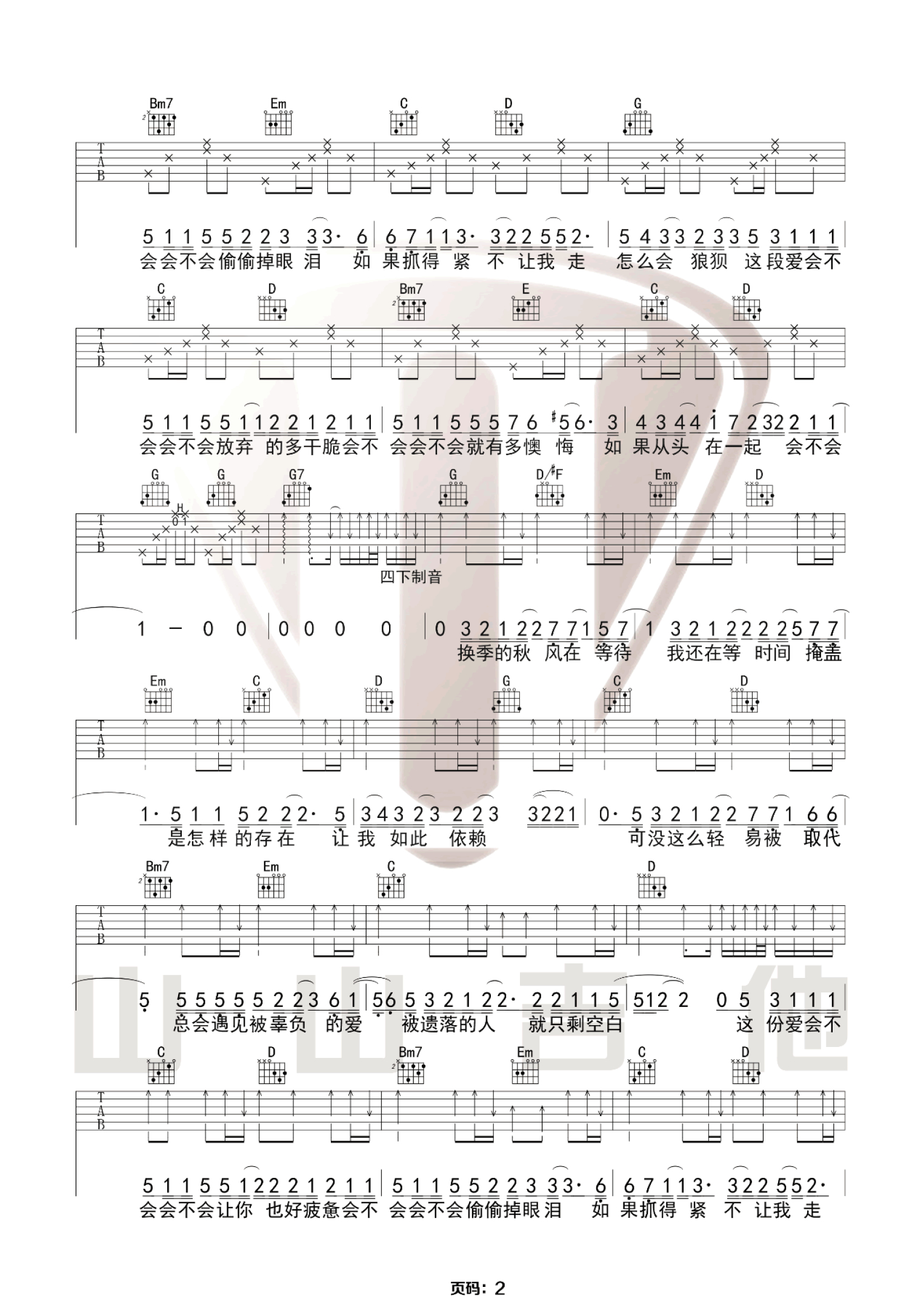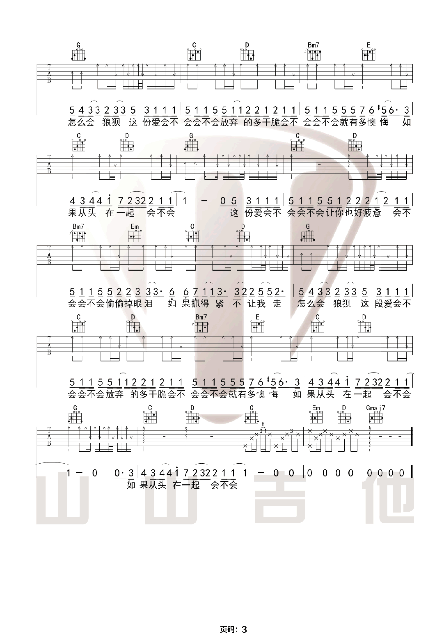 曲谱介绍: 原调升F,选调G,降半音调弦。会不会六线谱,吉他谱编有简单的前奏,主歌部分是分解和弦,副歌部分选用扫弦演奏,整体难度不大,适合新手进阶练习,"这份爱会不会让你也好疲惫会不会偷偷掉眼泪"你一直在问会不会,其实有答案了吧?每一次的相遇都有意义,不论最终结果怎样,我们也因这些相遇不断地成长。但愿每个人都能被温柔以待,收获甜蜜的爱情~