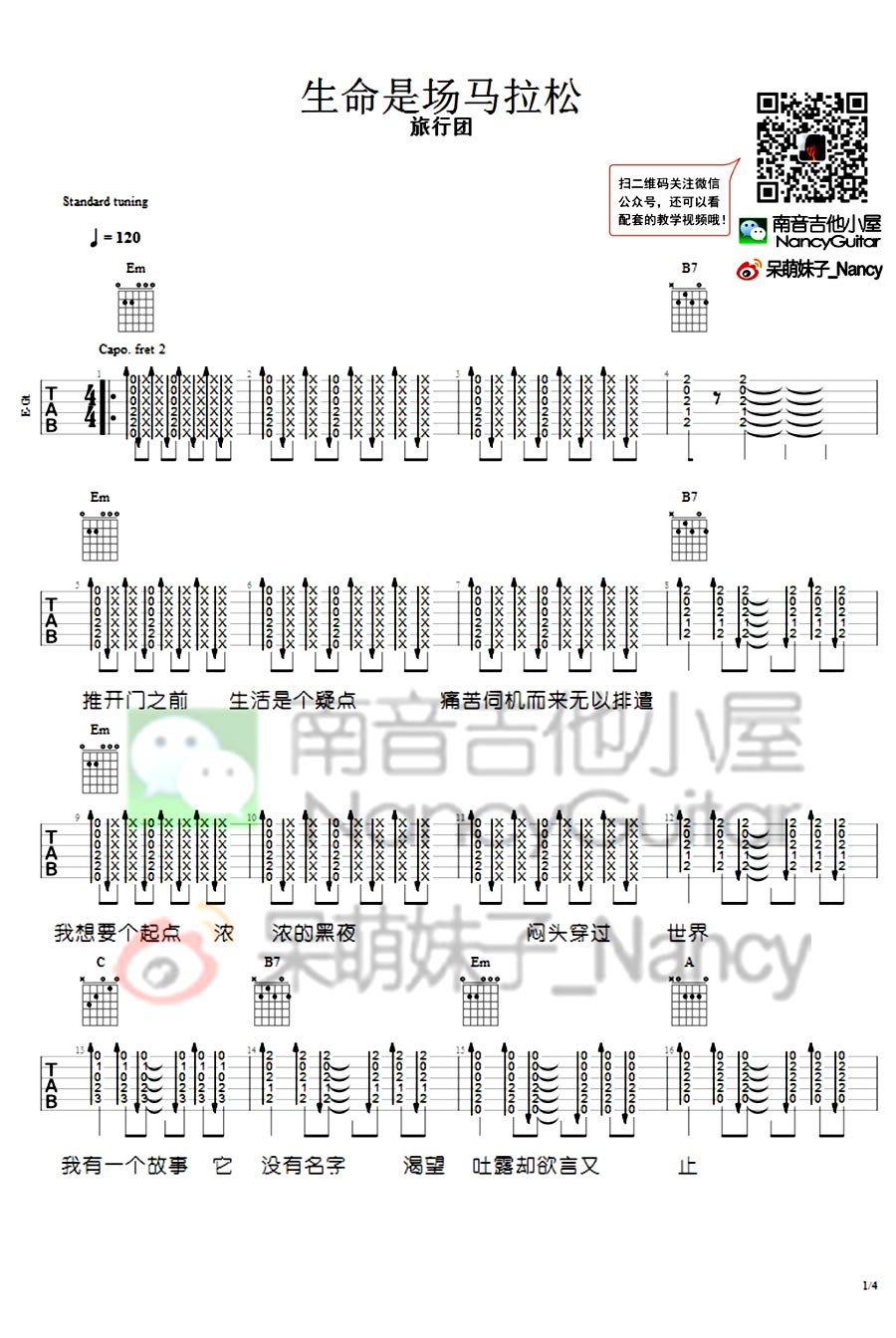 曲谱介绍: 旅行团乐队演唱,生命是场马拉松吉他谱,原曲Capo夹二品。琴友们可以认真学习扫弦节奏型的讲解。无论旋律线条还是节奏型,好听得让人不停,而生命主题的歌词很戳我心,趁着还年轻,赶快找个起点,跑完这场马拉松吧。