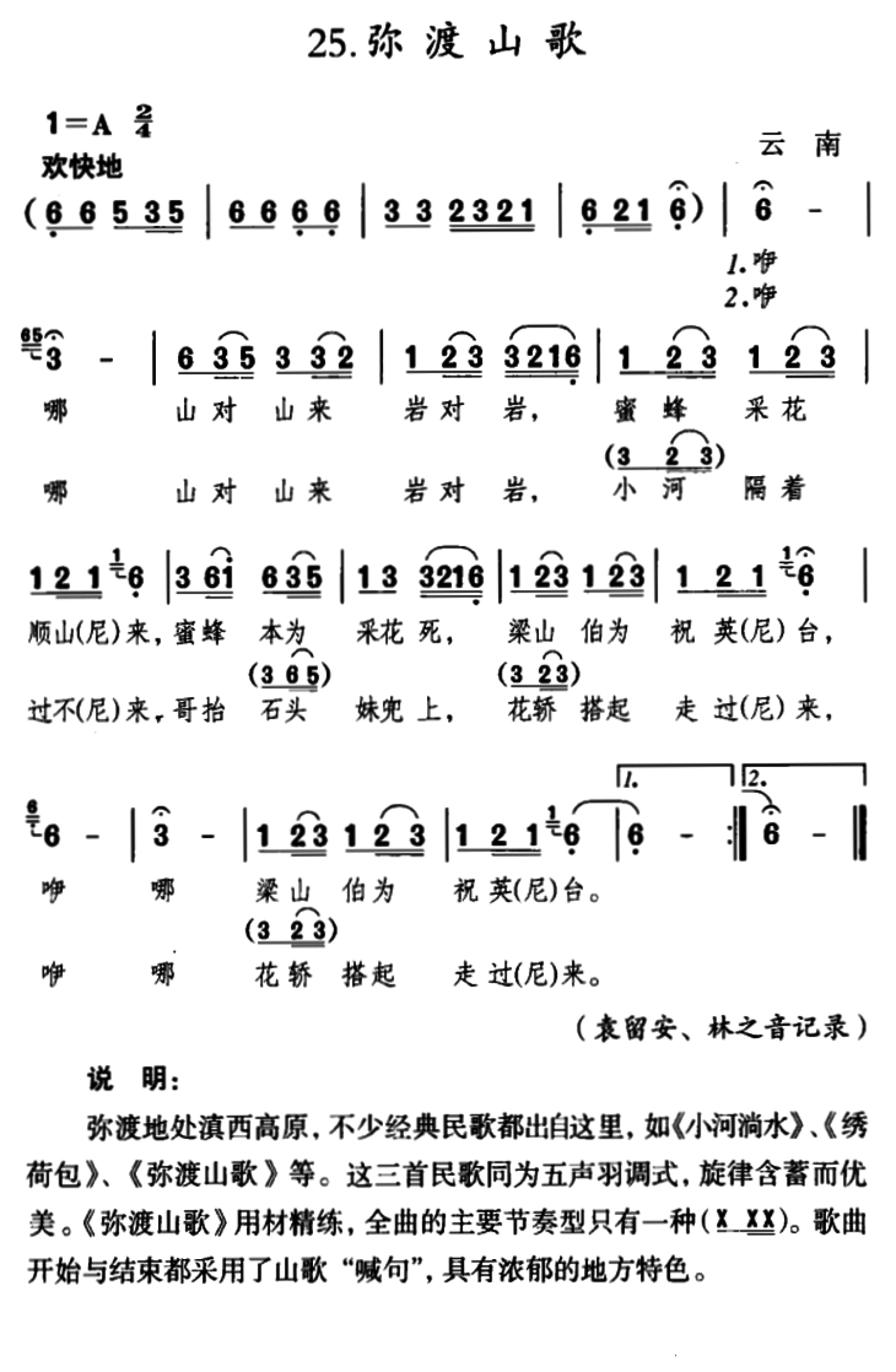 曲谱介绍: 云南山歌《弥渡山歌》歌词_简谱