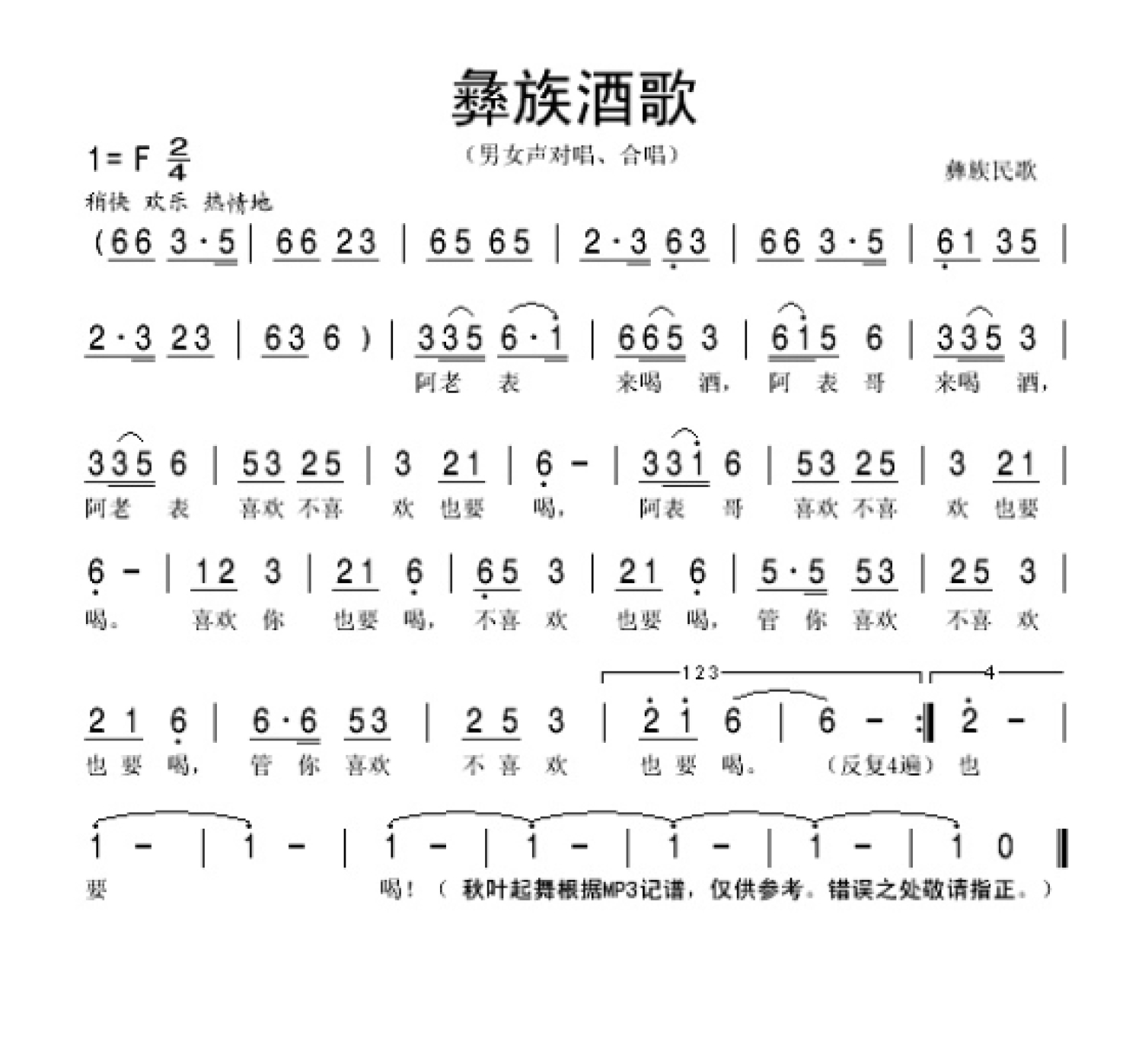 曲谱介绍: 彝族民歌《彝族酒歌》歌词_简谱