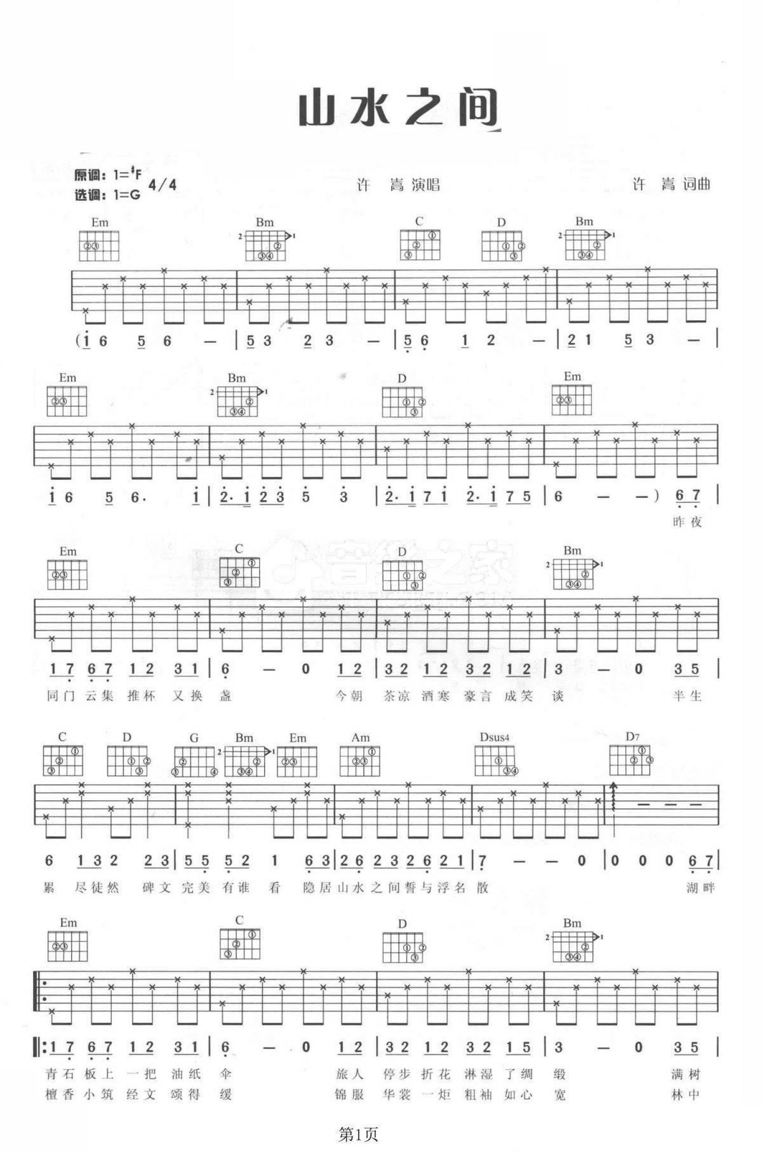 山水之间吉他谱 - 许嵩 - G调吉他弹唱谱