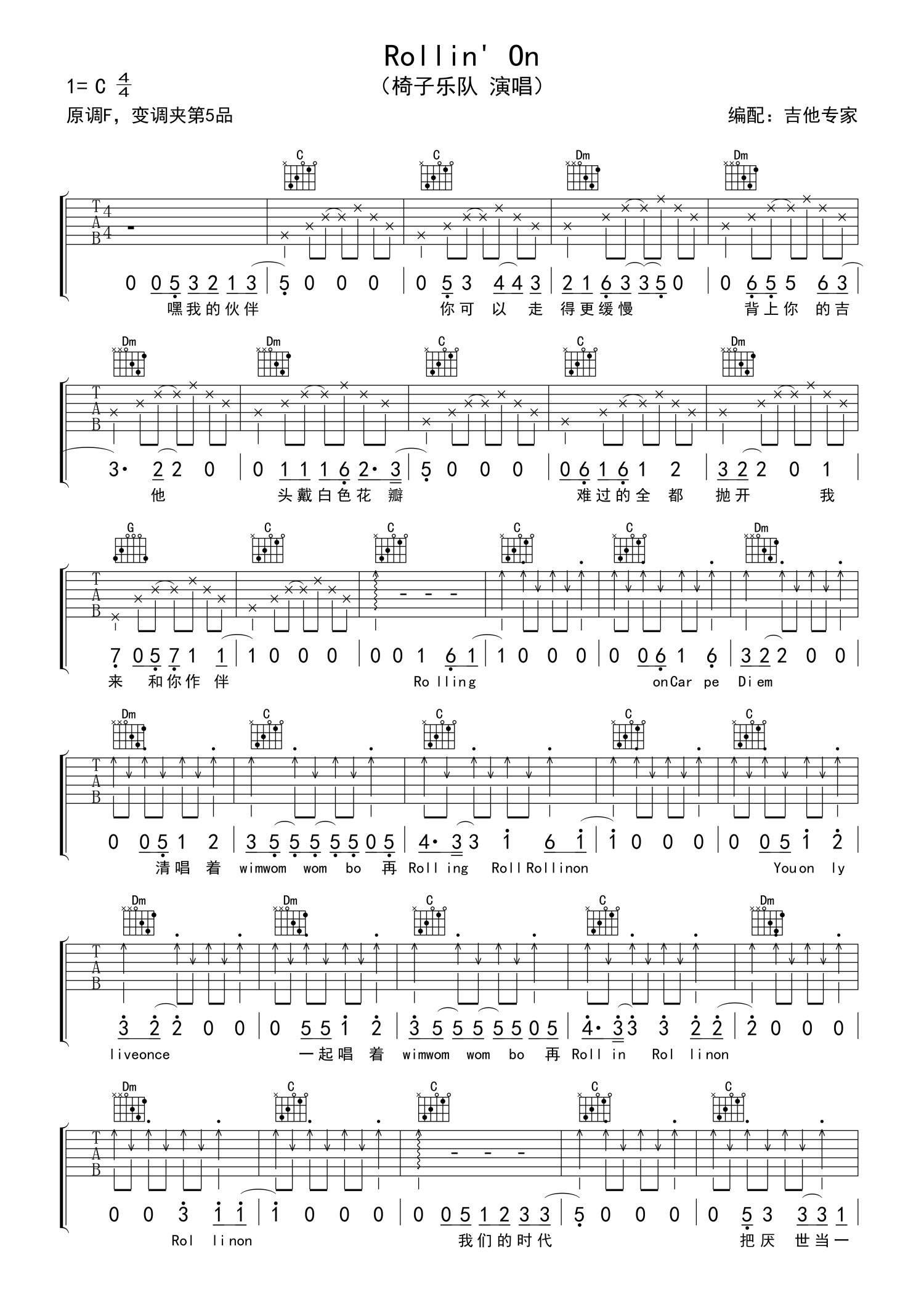 曲谱介绍: 椅子乐队《Rollin' On》吉他谱_C调吉他弹唱谱