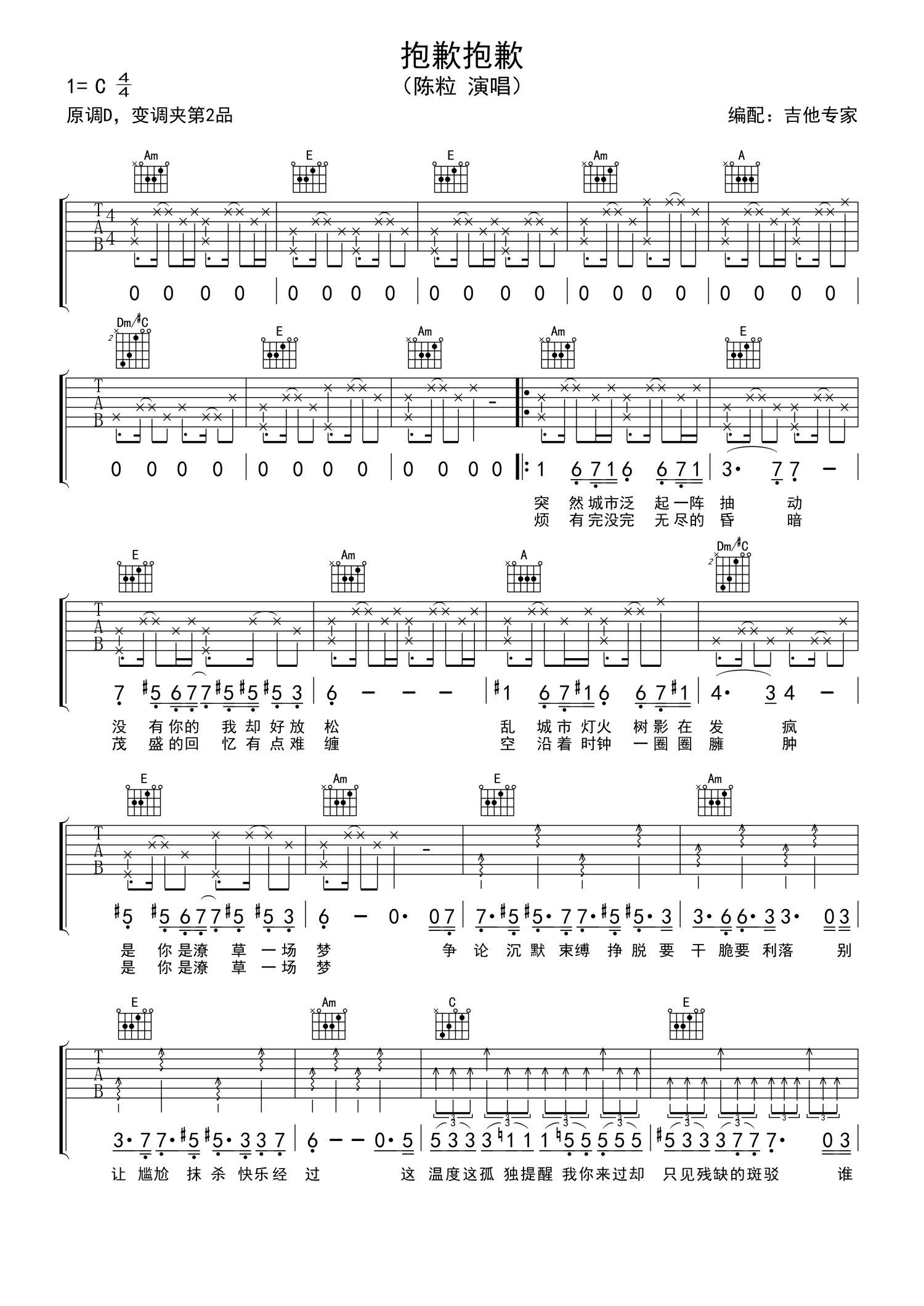 曲谱介绍: 陈粒《抱歉抱歉》吉他谱_C调吉他弹唱谱