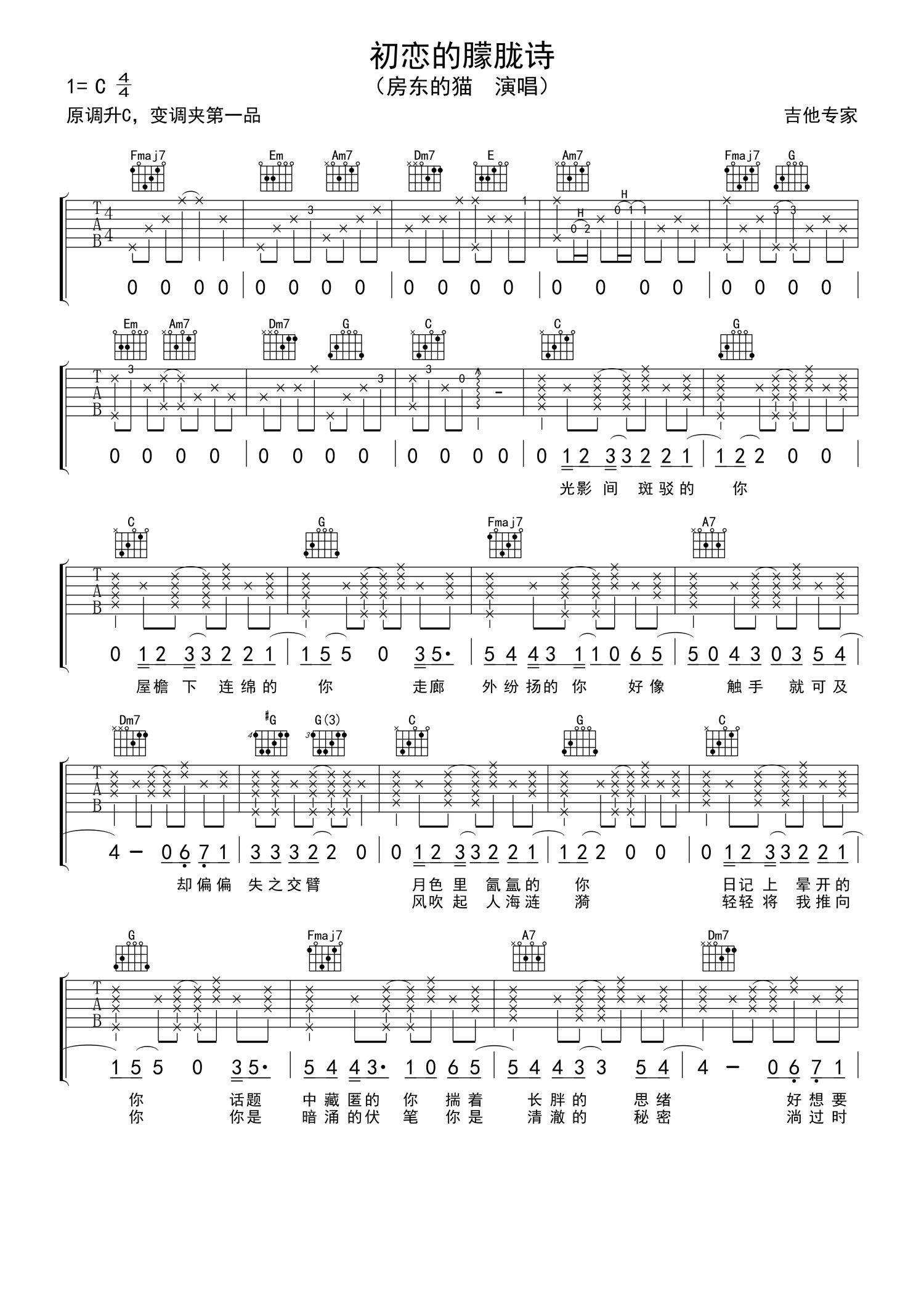曲谱介绍: 房东的猫《初恋的朦胧诗》吉他谱_C调吉他弹唱谱