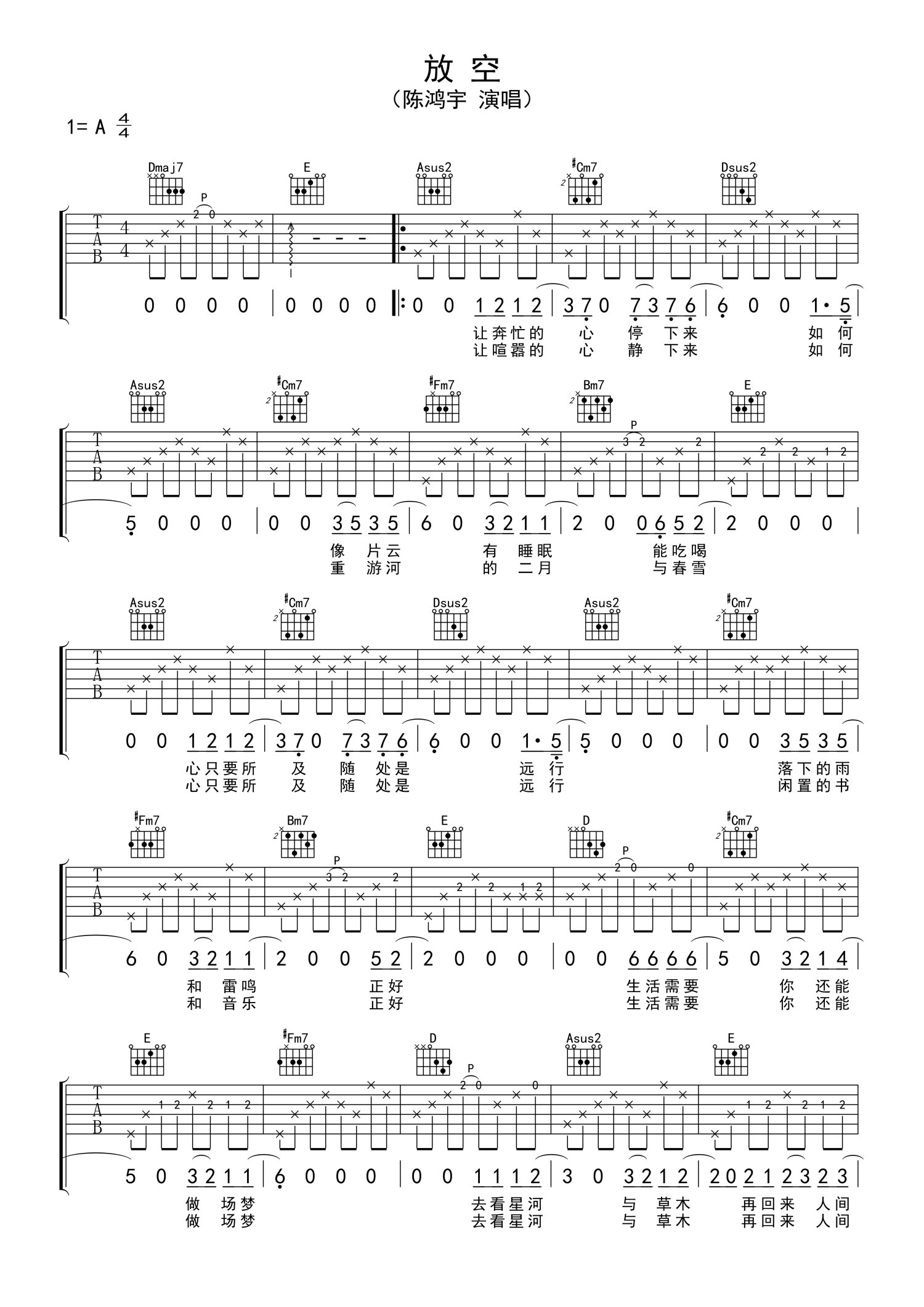 • 放空吉他谱 - 陈鸿宇 - A调吉他弹唱谱第1张