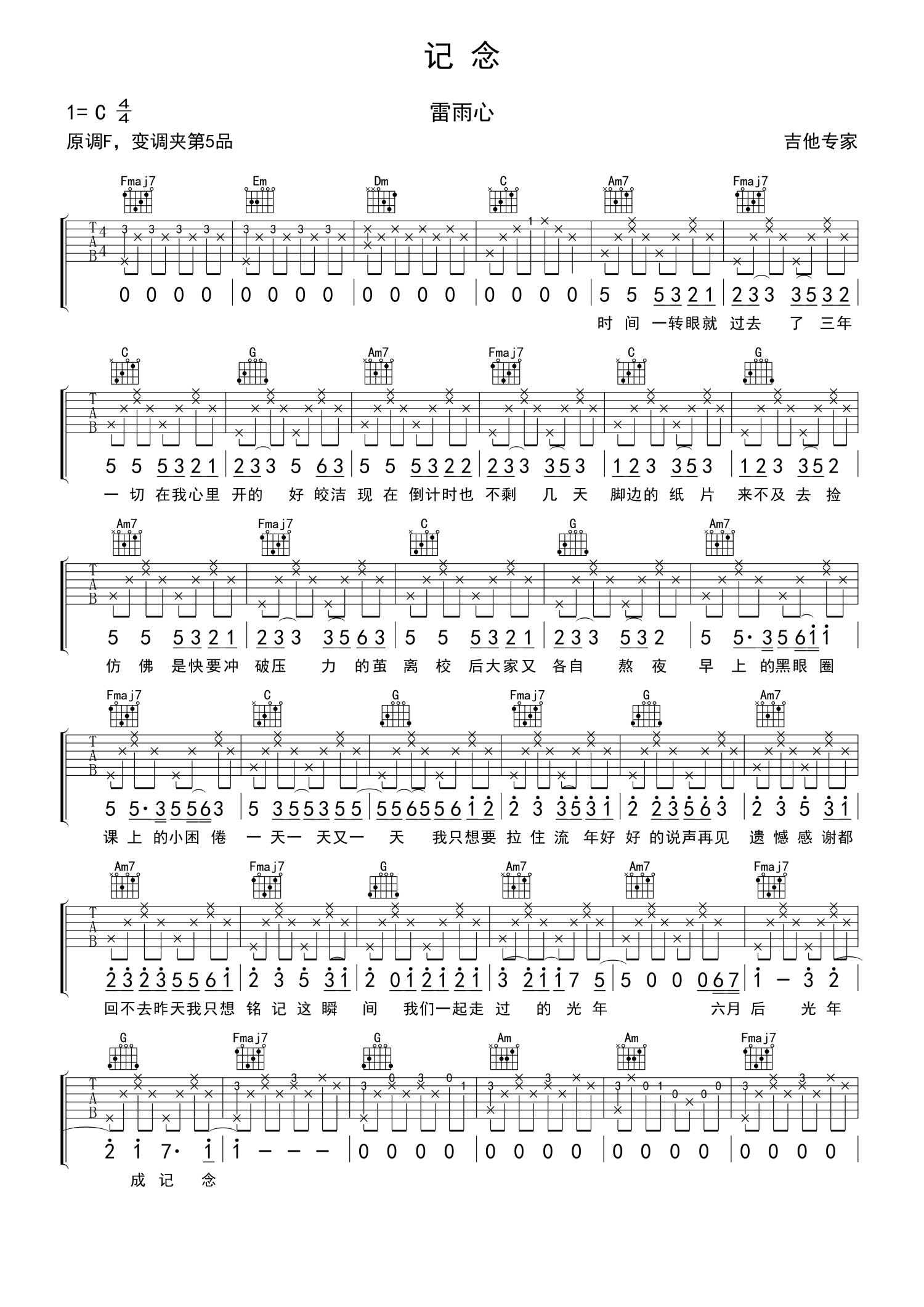 曲谱介绍: 雷雨心《纪念》吉他谱_C调吉他弹唱谱