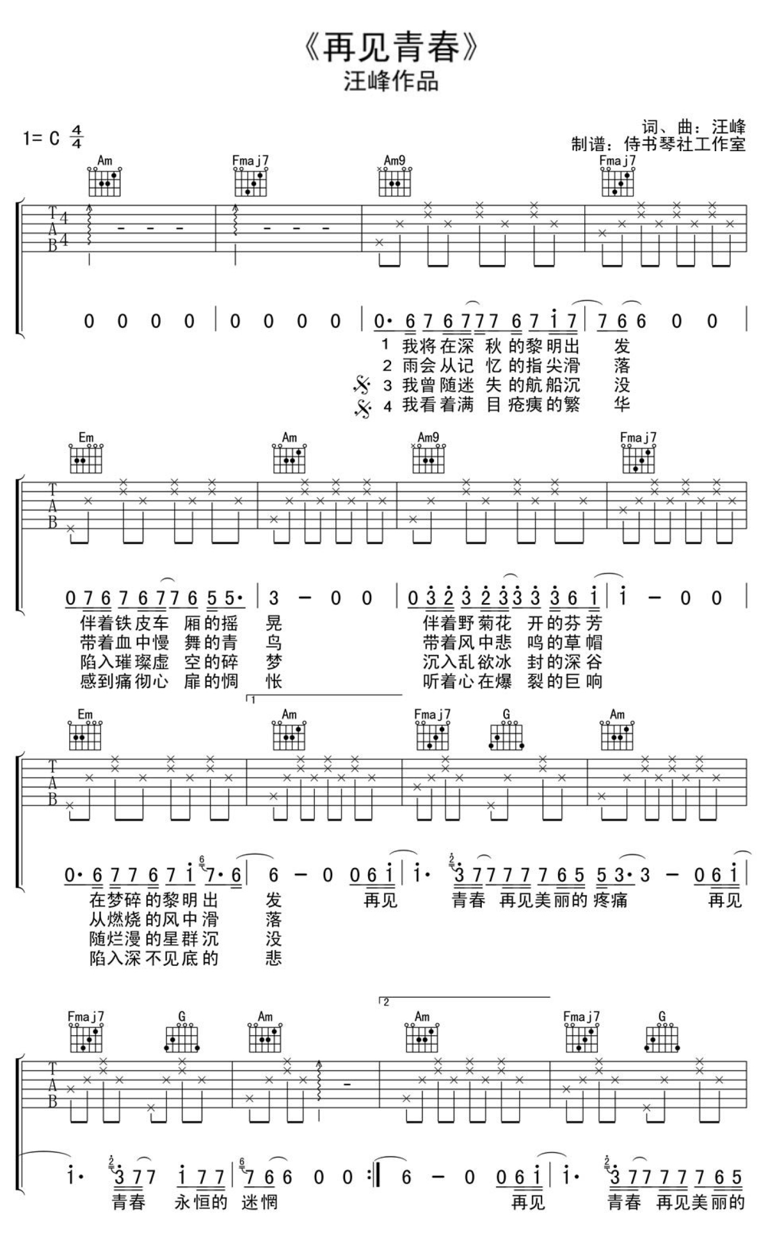 再见青春吉他谱 - 汪峰 - C调吉他弹唱谱