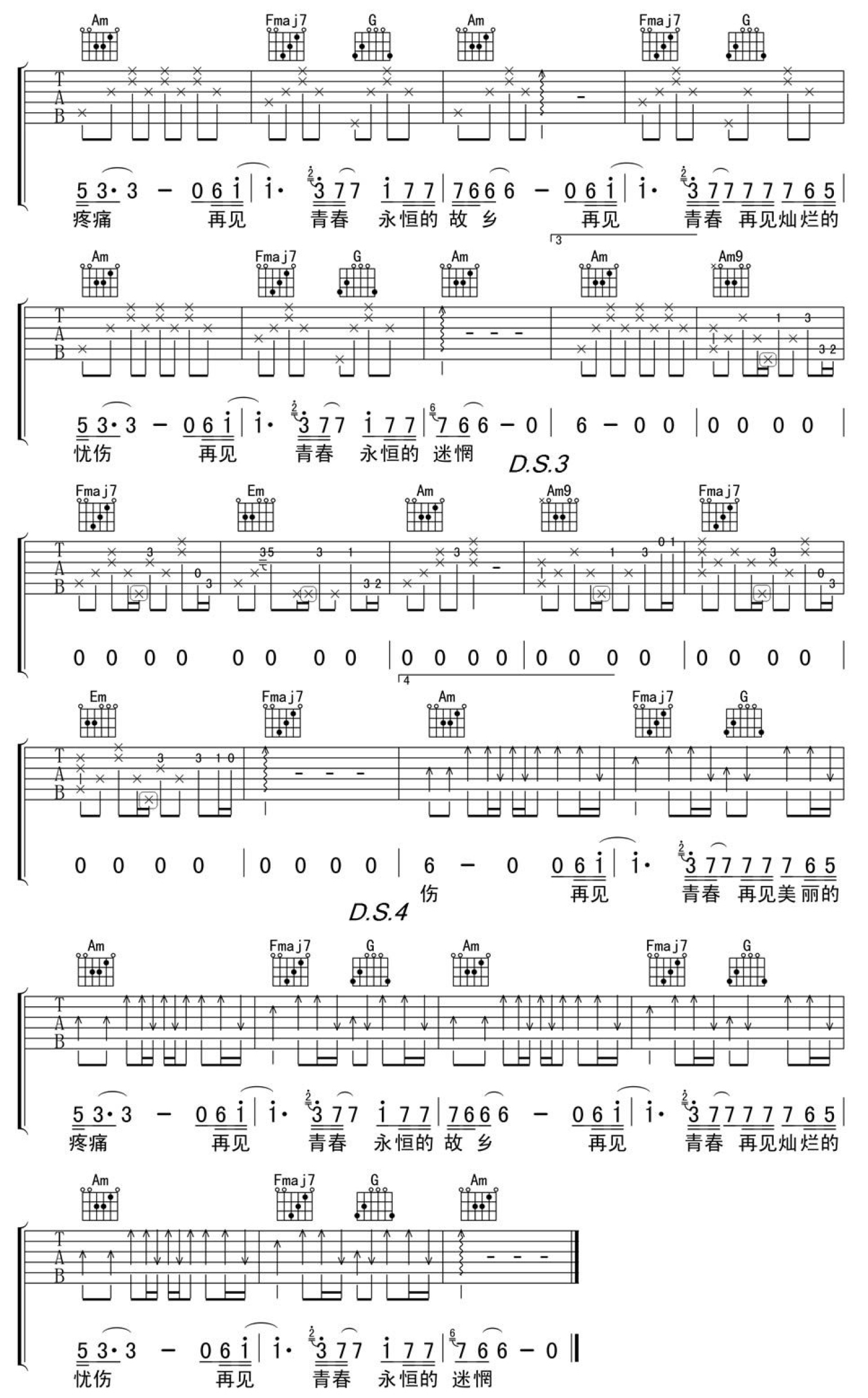 曲谱介绍: 汪峰再见青春吉他谱,C调弹唱谱,沧桑的嗓音唱出了对青春的憧憬与迷惘。歌曲用最嘶吼的言语唱出最无力的苍白,迷茫而荒凉,不需要人听懂,不需要所谓的知音,只为自己而存在。也许是最后的挣扎,但是至少证明了坚持,哪怕结果是继续,至少拥有了过程。