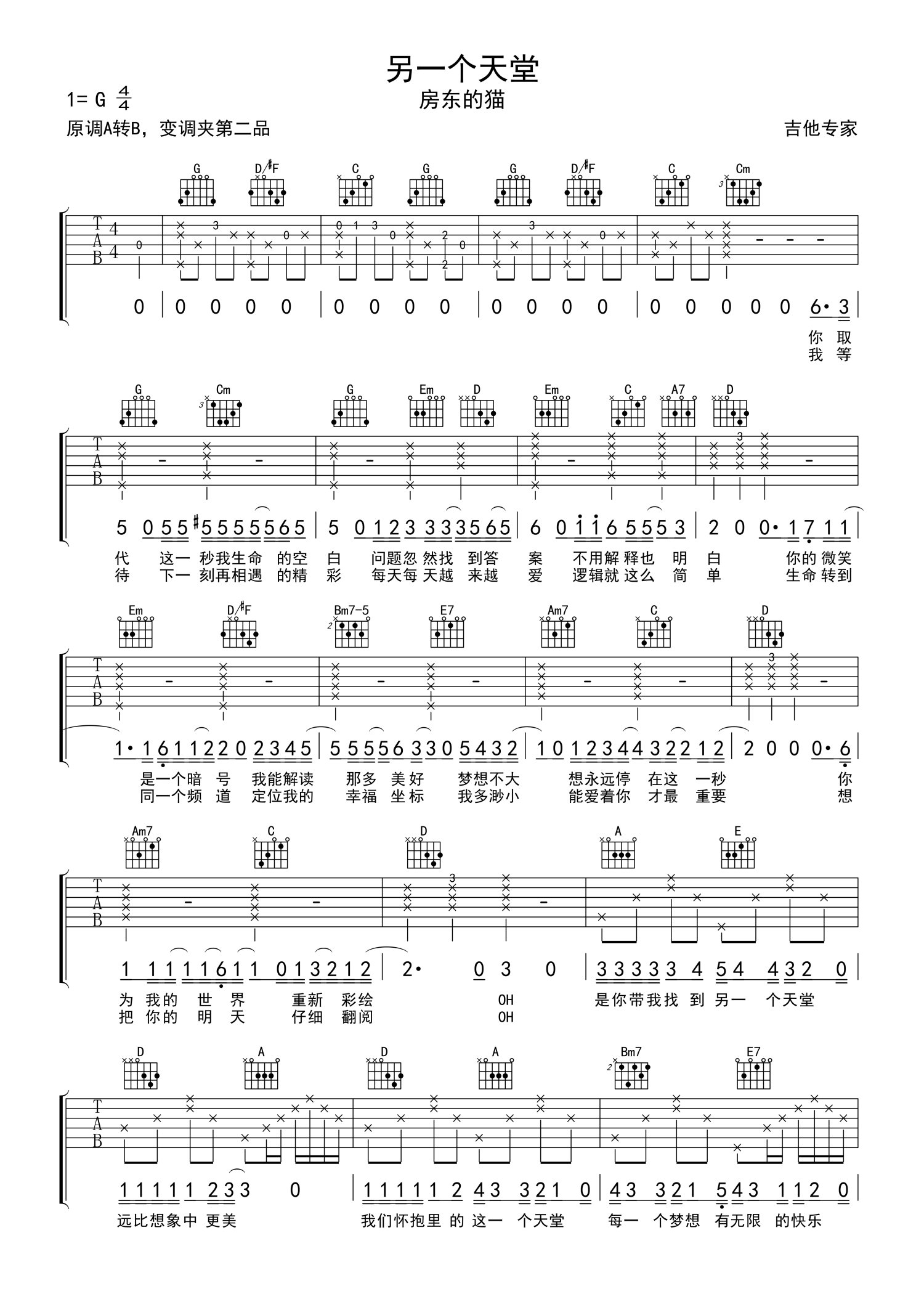 曲谱介绍: 房东的猫《另一个天堂》吉他谱_G调吉他弹唱谱