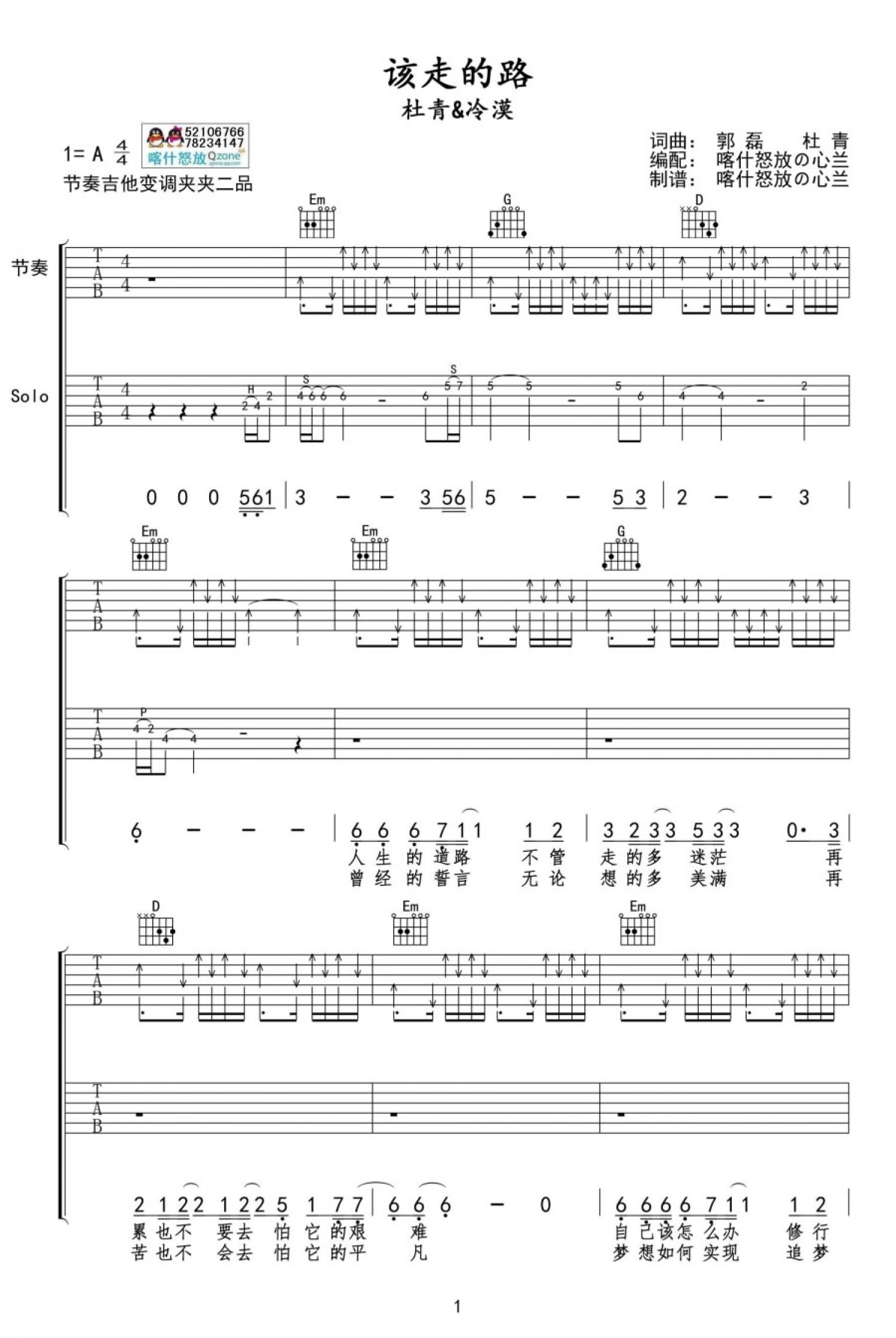 曲谱介绍: 该走的路吉他谱,杜青和冷漠独唱版编配,该走的路吉他弹唱谱,A调指法,节奏变调夹夹第二品。每个人都有自己人生该走的路,其实很多时候,答案在我们身边,一首歌曲唱出了真实的人生感悟,简单质朴的歌词里蕴含了人生的真谛。