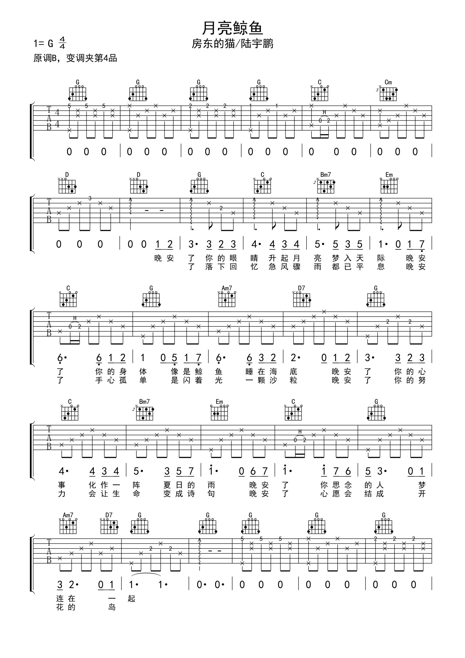 曲谱介绍: 房东的猫/陆宇鹏《月亮鲸鱼》吉他谱_G调吉他弹唱谱