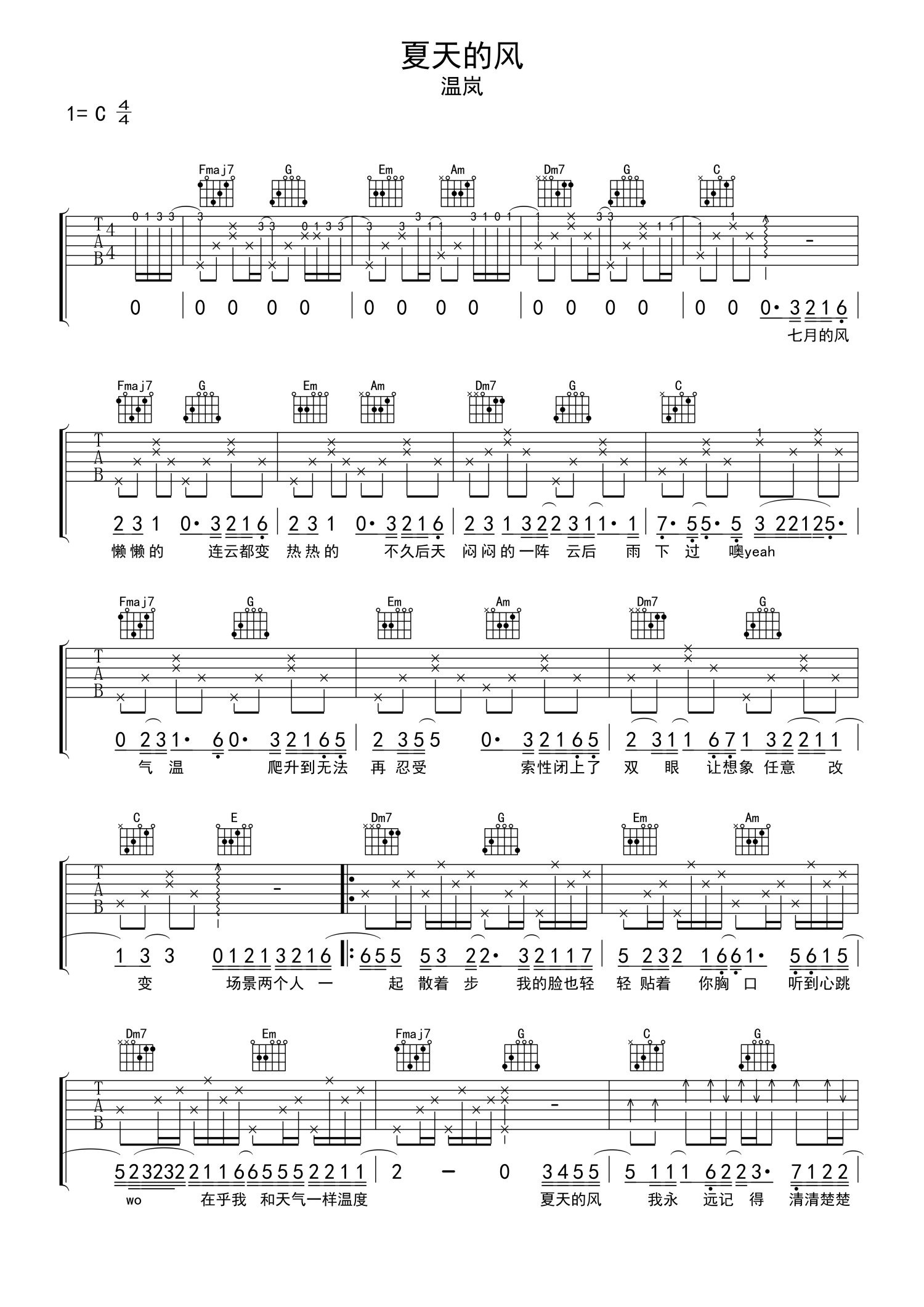 曲谱介绍: 温岚《夏天的风》吉他谱_C调吉他弹唱谱