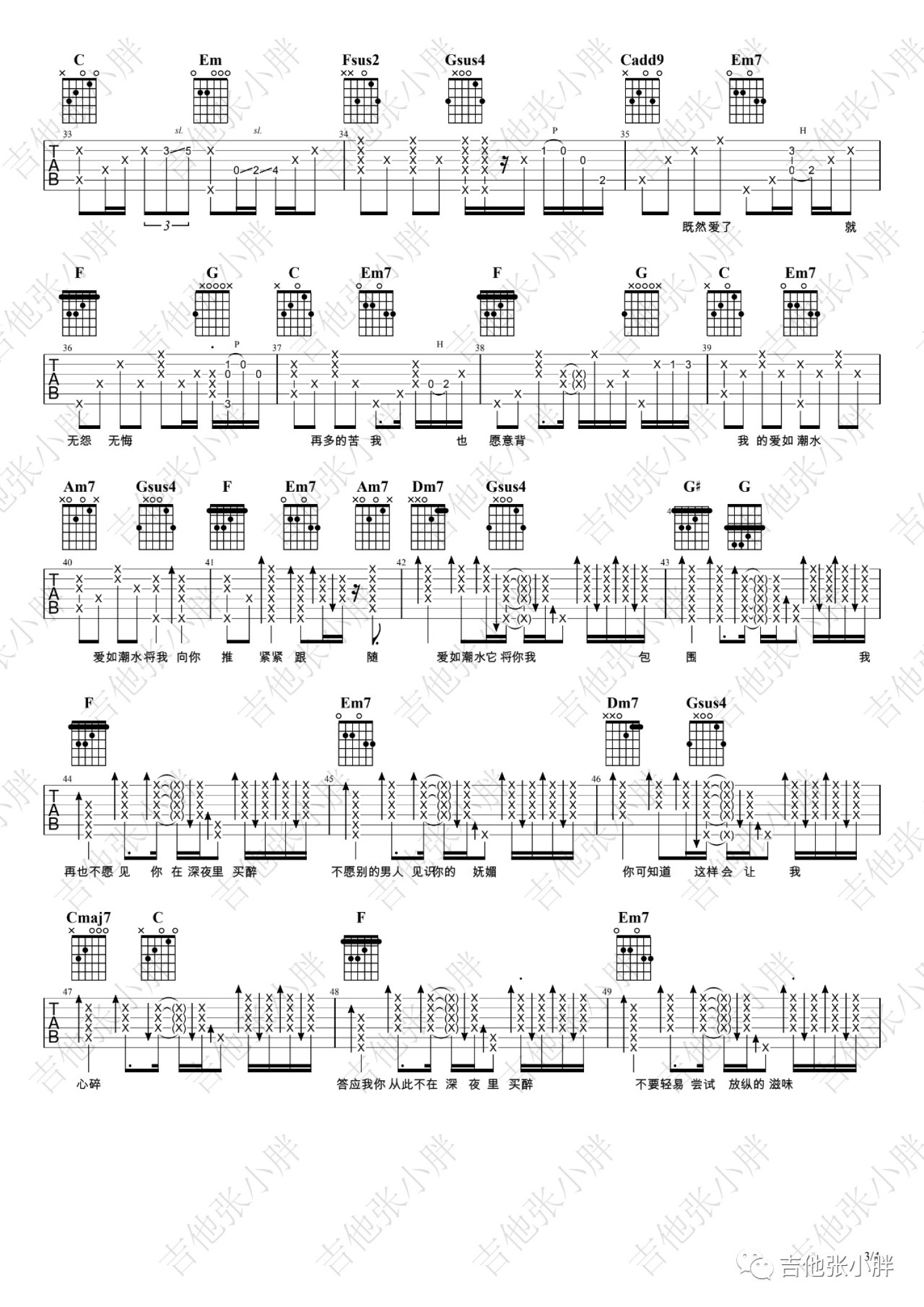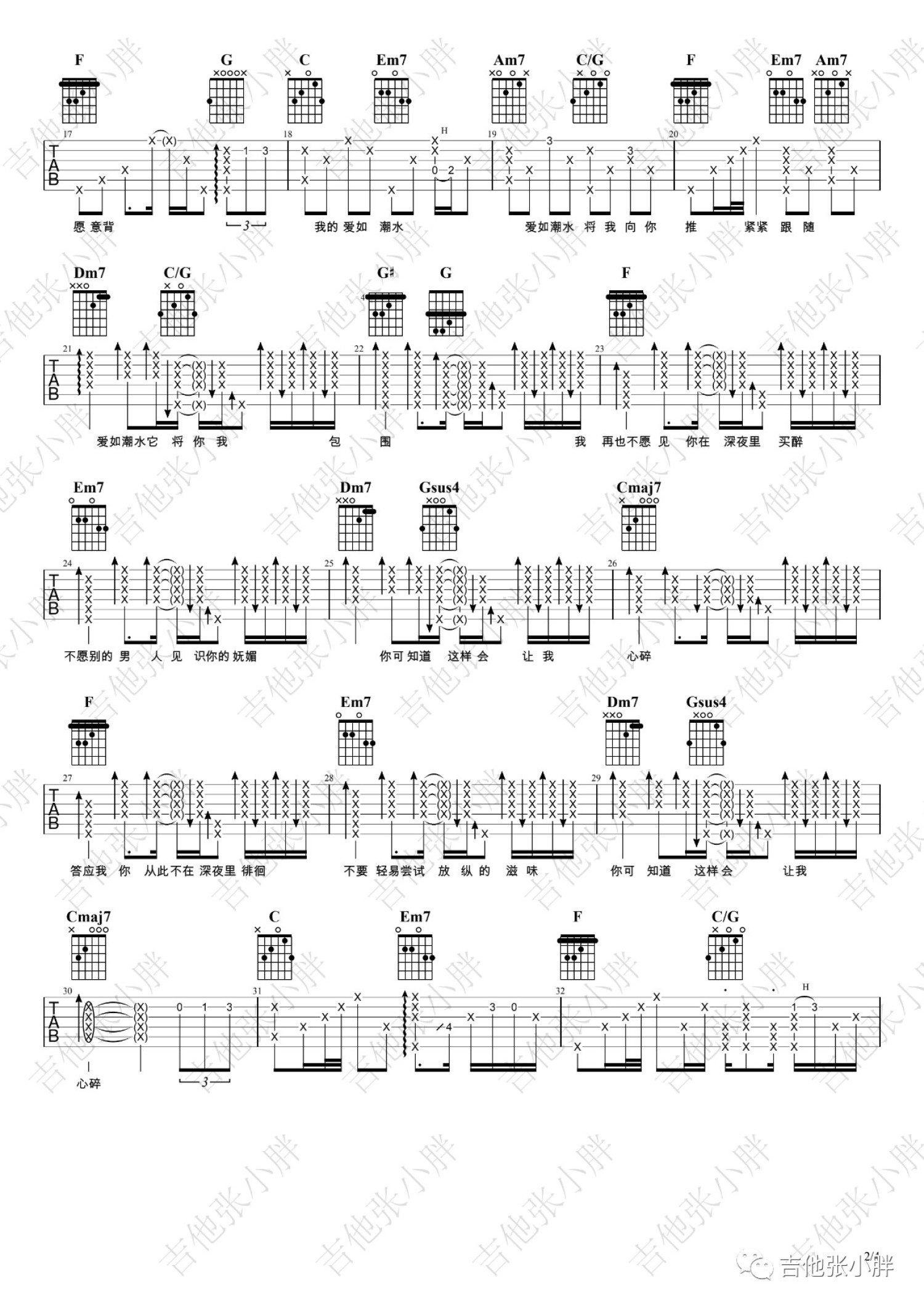 曲谱介绍: 一首家喻户晓的歌,张信哲的代表作之一,这首曲风哀婉的情歌奠定了张信哲独特的情歌风格。张信哲用温柔的声音诠释出爱情里的不圆满和无奈,也唱出了永恒的经典,听众也可以从他细腻的感情线中找到淡淡的温暖。爱如潮水吉他弹唱视频演示来自编配《爱如潮水》吉他谱,C调和弦指法编配,前奏尽量还原原版的音符,后面就放飞自我,跟着感觉走了。你也可以不必按谱子来,找到合适的扫弦节奏。